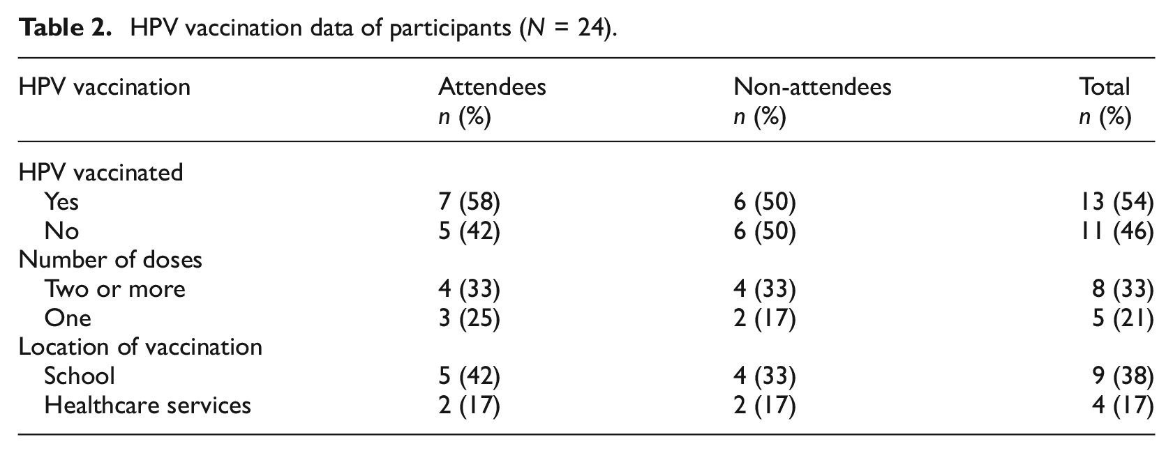 In total, 24 participants were interviewed, comprising 12 attendees and 12 non-attendees (see Table 1 for sample characteristics). The median age of the final sample was 27 (range = 26-29), all participants identified as women, and the majority were either partnered (