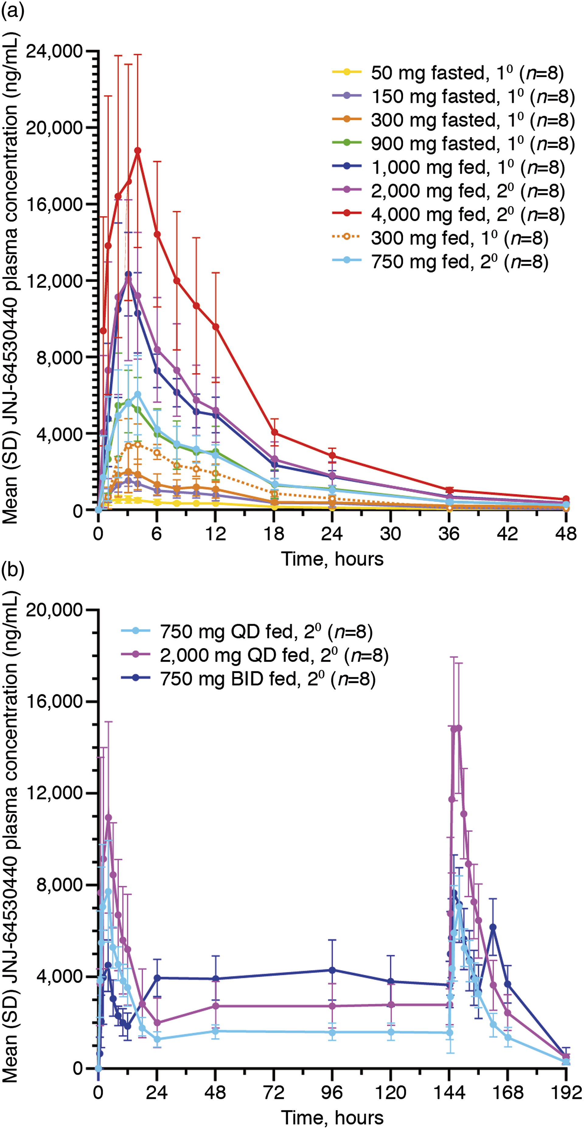 Less than dose-proportional increases in maximum plasma concentrations (Cmax) and area under the plasma concentration–time curves (AUCs) were observed across the doses. Mean plasma half-lives ranged from 9.3 to 14.5 h. Cmax and AUC were ∼two fold higher under fed versus fasting conditions and slightly higher in Asians versus Caucasians. JNJ-64530440 doses ≥750 mg achieved plasma levels higher than protein-binding adjusted concentrations demonstrating