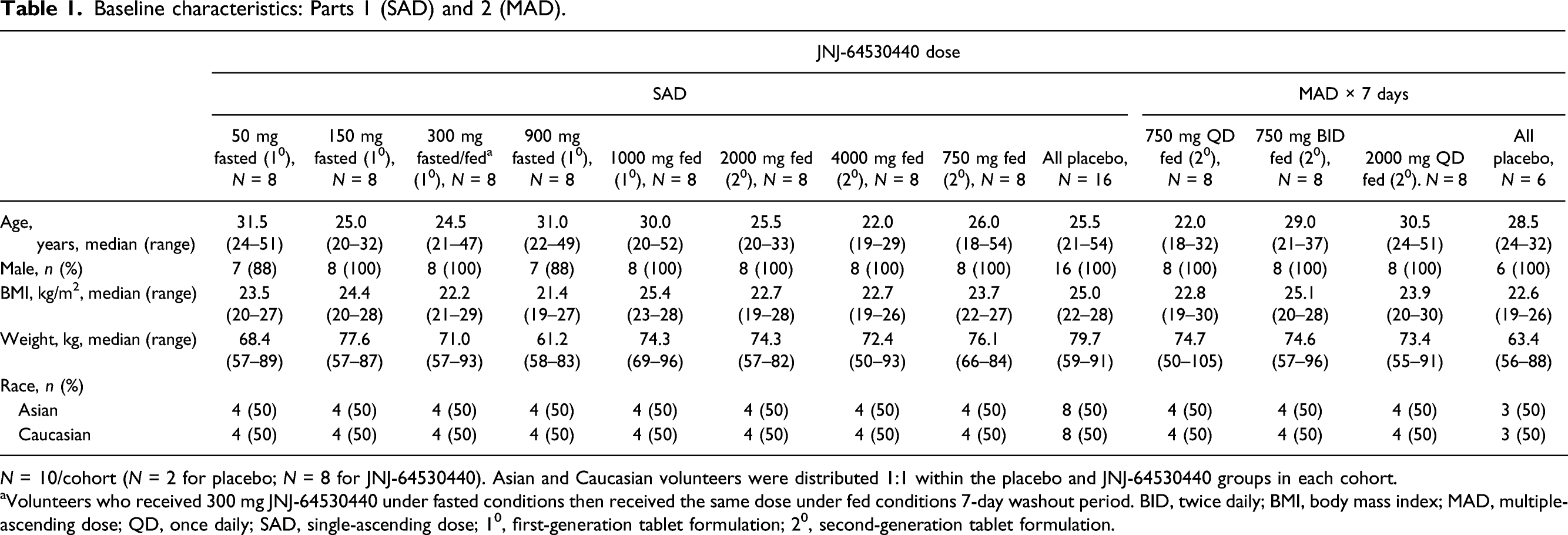 aVolunteers who received 300 mg JNJ-64530440 under fasted conditions then received the same dose under fed conditions 7-day washout period. BID, twice daily; BMI, body mass index; MAD, multiple-ascending dose; QD, once daily; SAD, single-ascending dose; 10, first-generation tablet formulation; 20, second-generation tablet formulation.