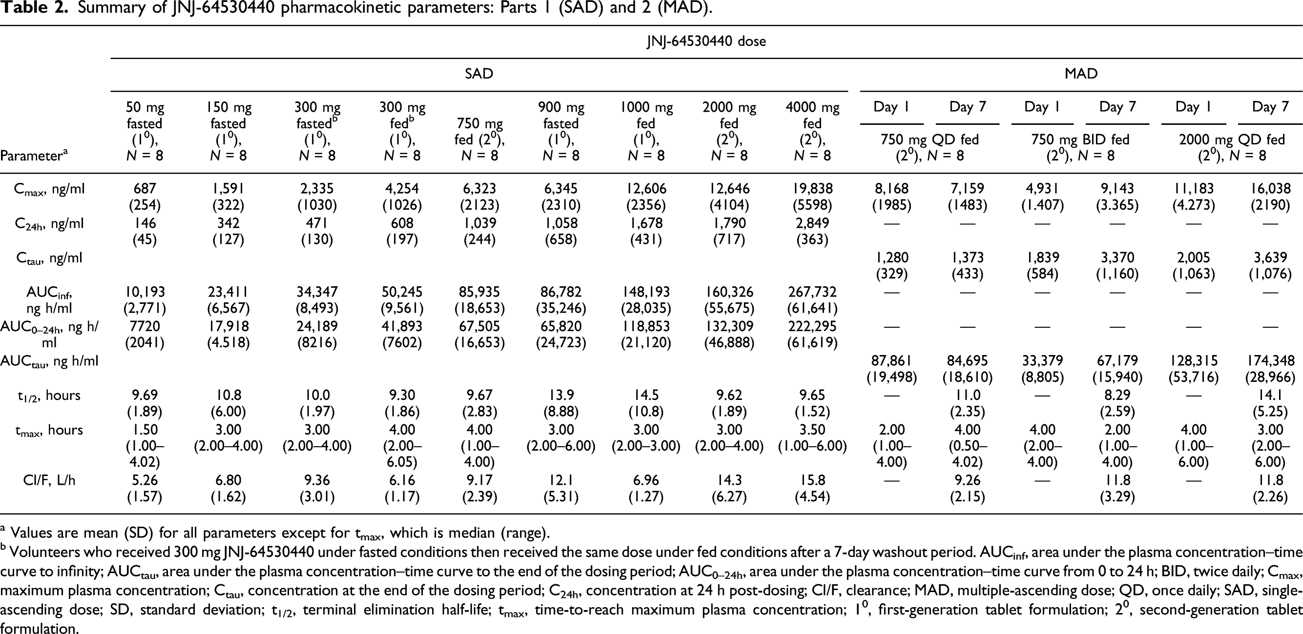 Plasma concentrations of JNJ-64530440 are shown in Figure 1A. After administration of single oral doses of JNJ-64530440 ranging from 50 to 900 mg under fasted conditions, JNJ-64530440 Cmax and AUCinf increased with dose (Table 2), although these increases were not dose proportional. Under fed conditions, less than dose-proportional increases in JNJ-64530440 Cmax and AUCinf occurred following single oral doses of JNJ-64530440 ranging from 300 to 4000 mg (Table 2). JNJ-64530440 plasma concentrations following (A) single doses and (B) multiple doses (on days 1 and 7, blood samples were collected over 24 h); 10, first-generation tablet formulation; 20, second-generation tablet formulation; BID, twice daily; QD, once daily; SD, standard deviation. Summary of JNJ-64530440 pharmacokinetic parameters: Parts 1 (SAD) and 2 (MAD). a Values are mean (SD) for all parameters except for tmax, which is median (range). b Volunteers who received 300 mg JNJ-64530440 under fasted conditions then received the same dose under fed conditions after a 7-day washout period. AUCinf, area under the plasma concentration–time curve to infinity; AUCtau, area under the plasma concentration–time curve to the end of the dosing period; AUC0–24h, area under the plasma concentration–time curve from 0 to 24 h; BID, twice daily; Cmax, maximum plasma concentration; Ctau, concentration at the end of the dosing period; C24h, concentration at 24 h post-dosing; Cl/F, clearance; MAD, multiple-ascending dose; QD, once daily; SAD, single-ascending dose; SD, standard deviation; t1/2, terminal elimination half-life; tmax, time-to-reach maximum plasma concentration; 10, first-generation tablet formulation; 20, second-generation tablet formulation.