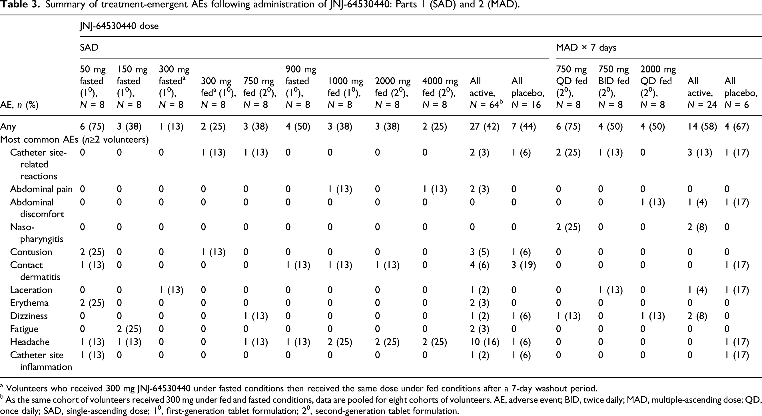 Summary of treatment-emergent AEs following administration of JNJ-64530440: Parts 1 (SAD) and 2 (MAD).