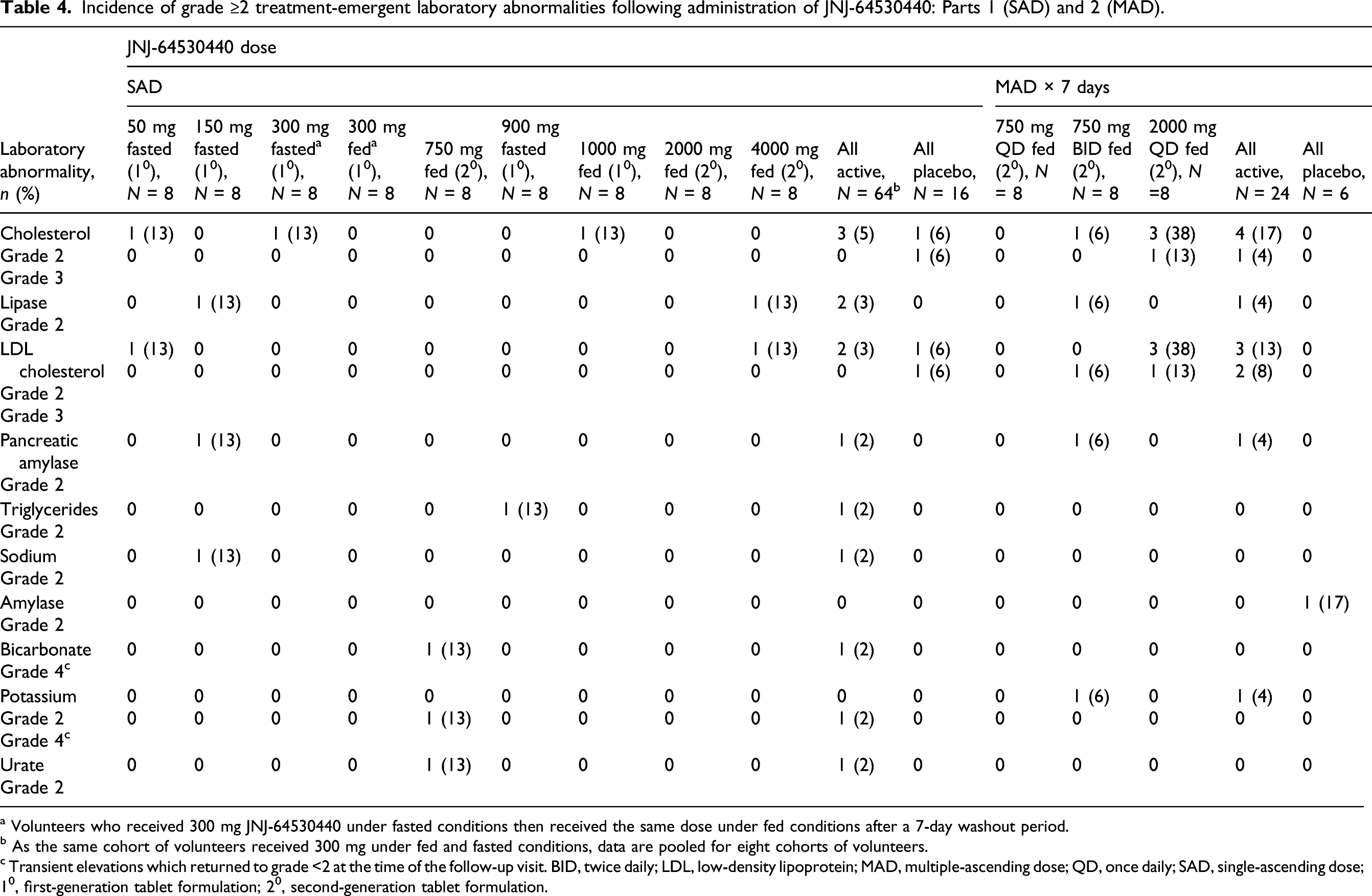 Incidence of grade ≥2 treatment-emergent laboratory abnormalities following administration of JNJ-64530440: Parts 1 (SAD) and 2 (MAD).
