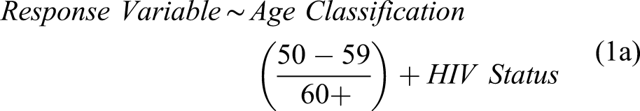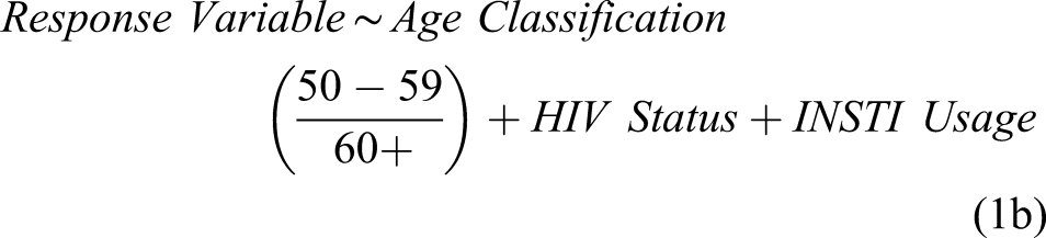 Demographic variables were compared using Kruskal–Wallis for continuous and Fisher’s exact test for categorical variables. A series of linear models were used to test for differences by HIV status or INSTI usage after correcting for age. For equations (1a) and (1b), the following variables were included as response variables: total body fat percentage, FMI, android/gynoid ratio, and trunk-to-leg fat ratio. Rather than using age as a continuous variable, participants were classified as either age 50–59 years old or ≥60 years old due to previously described limitations in data availability for HIV-seronegative controls.
