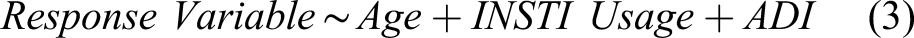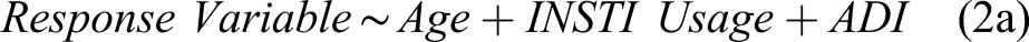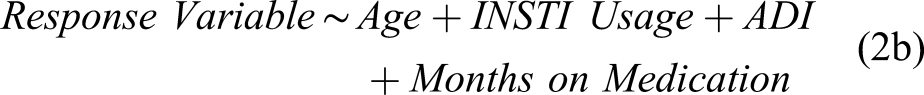 Body composition characteristics between men on INSTI and non-INSTI regimens: Differences in fat mass index and trunk-to-leg ratio were no longer observed once we control for socioeconomic status, as measured by Area Deprivation Index (ADI). Controlling for months on medication further eliminates observed differences in body composition; however, very few samples were available for analyses including time on medication. These results are associated with equations (2a) and (2b).