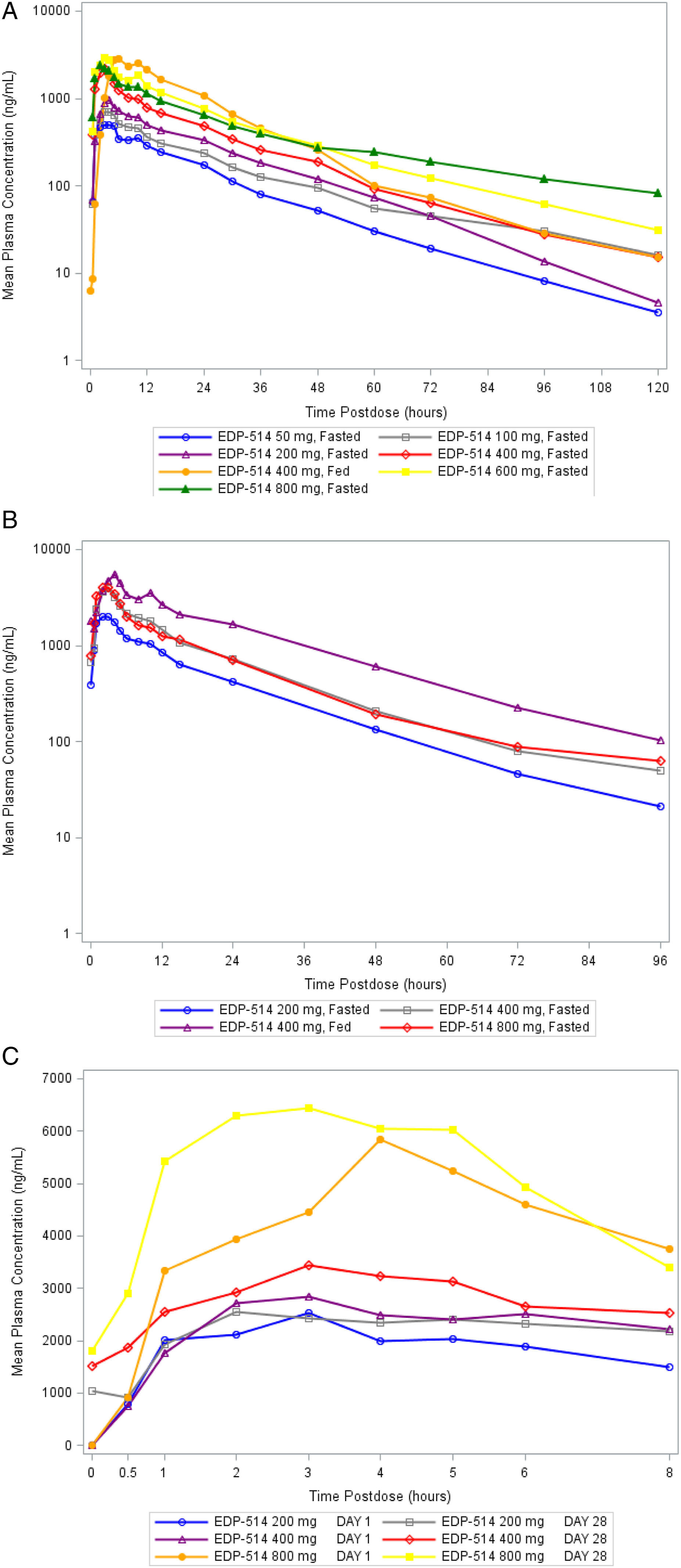EDP-514 exhibited an increase in metabolite (EP-027513, EP-029109, EP-029564) exposures with dose (data not shown). For EP-027513, EP-029109, and EP-029564, the metabolic ratio for AUClast ranged from 0.06 to 0.09, 0.04 to 0.06, and 0.03 to 0.05, respectively, across the dose range of 50–800 mg, and AUC was not impacted by food at the 400 mg dose.