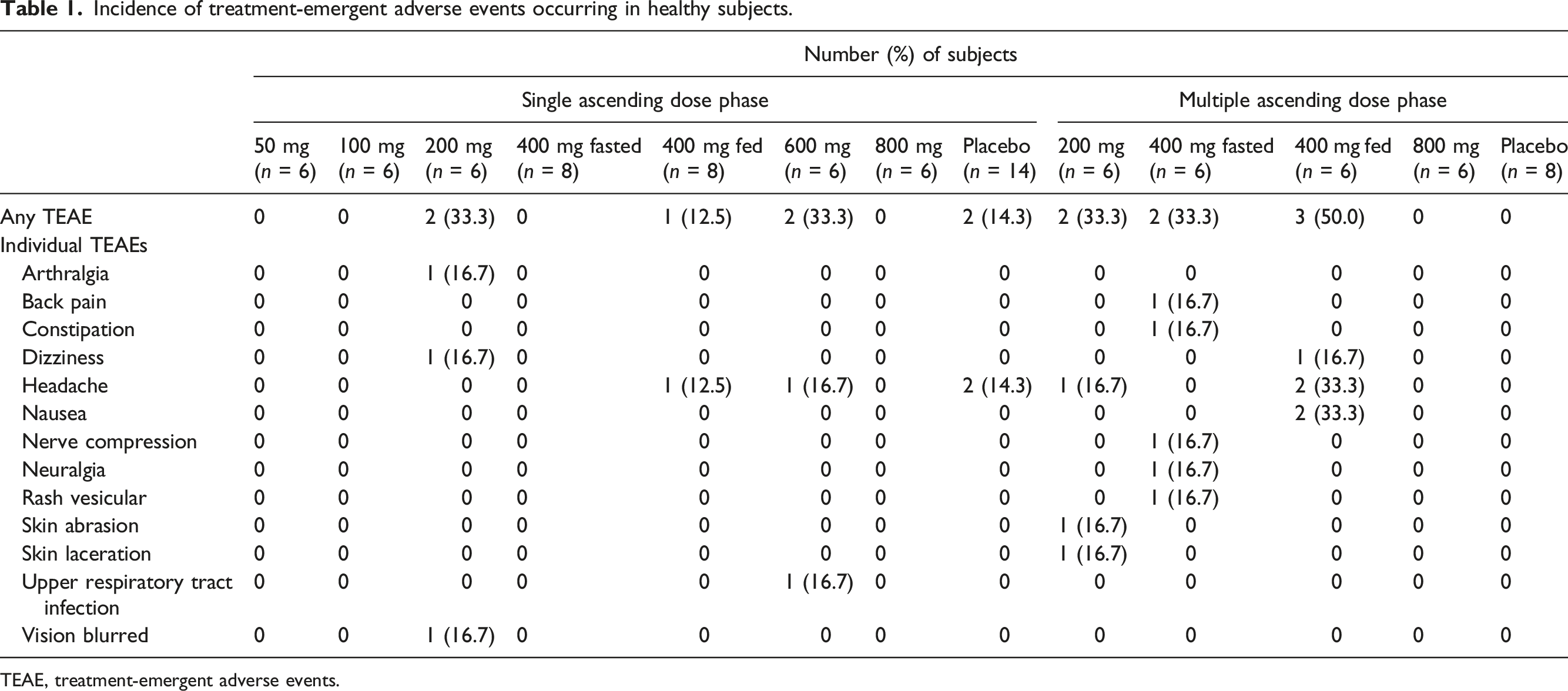 In Part 1, 50 subjects were randomized in the SAD phase and 32 subjects in the MAD phase (Supplementary Figure 1). One (16.7%) subject in the SAD 100 mg group withdrew consent. One subject (16.7%) in the MAD 800 mg group withdrew consent. Thus, 49 subjects in the SAD phase, and 31 subjects in the MAD phase completed the study.