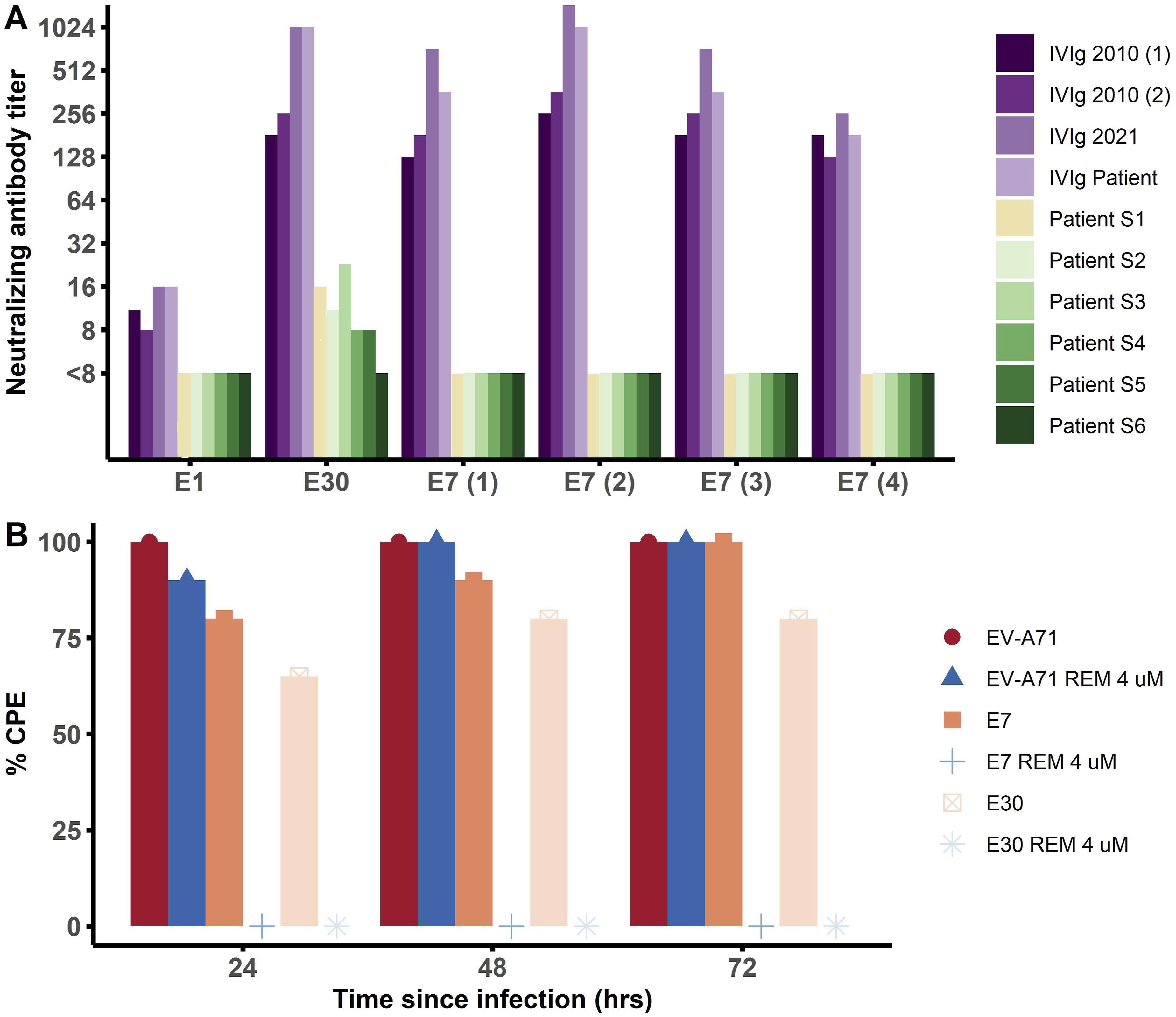 We tested the Efficacy of IVIg and remdesivir against clinical enterovirus isolates. (a) Neutralizing antibody (nAb) titers against echovirus 1 (E1), echovirus 30 (E30) and four strains of echovirus 7 (E7) in IVIg from four different batches (shades of purple), including the one that the patient received (IVIg patient), and in six sera (S, shades of green) from the patient before (S1, obtained in 2022) and during the infection (S2-6, obtained between April and July 2024). nAb titers are averages of duplicate measurements, calculated using the Reed Muench method. nAb titers ≥16 and ≥32 were considered positive and protective, respectively. (b) Enterovirus A71 (EV-A71), E7 (3) and E30 cytopathogenic effect (CPE) in single measurements on RD cells after 24, 48 and 72 h of incubation without (shades of red) and with (shades of blue) 4 μM remdesivir (REM). Lower CPE indicates stronger inhibition of the virus.
