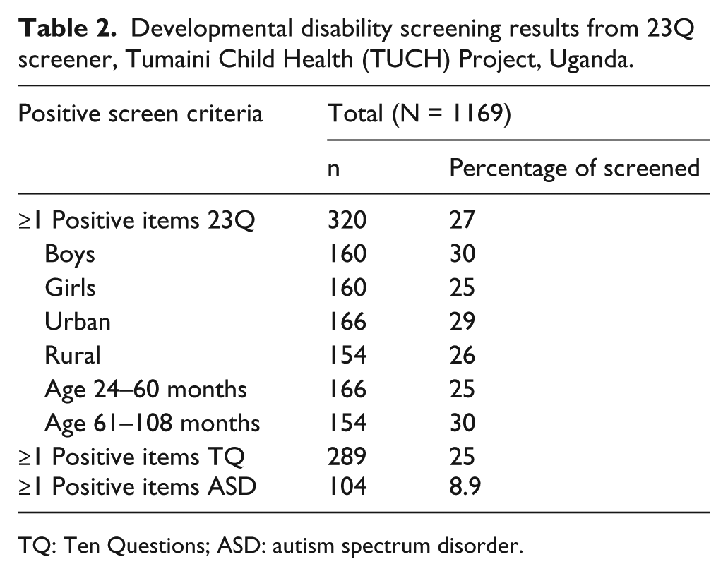 Developmental disability screening results from 23Q screener, Tumaini Child Health (TUCH) Project, Uganda.