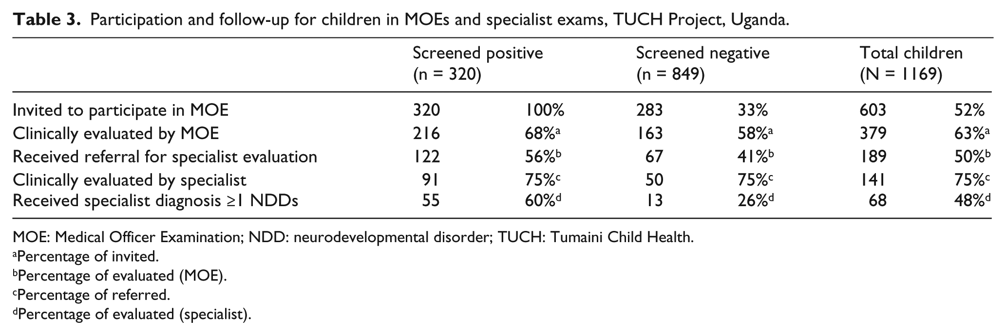 Participation and follow-up for children in MOEs and specialist exams, TUCH Project, Uganda.