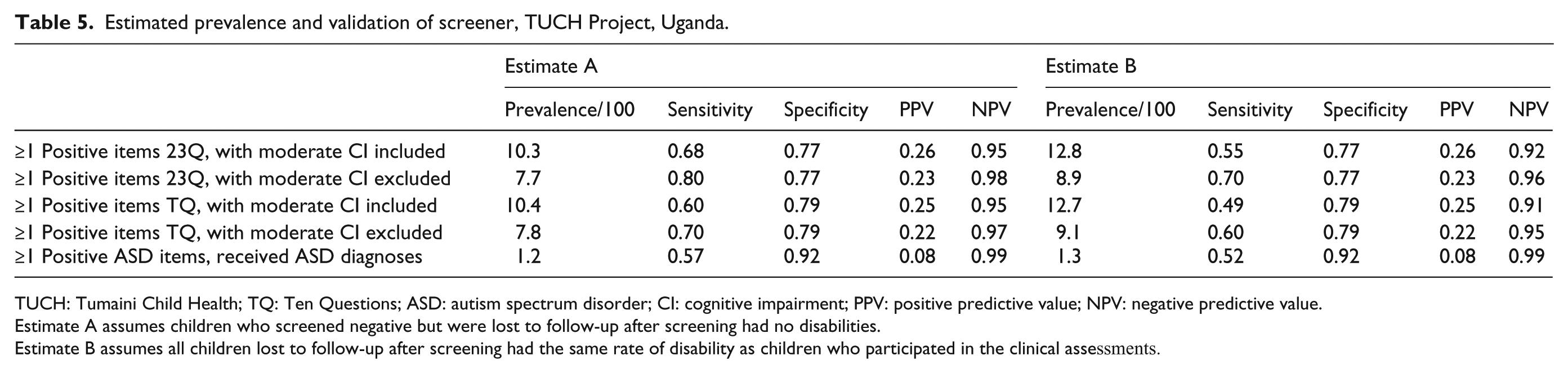 TUCH: Tumaini Child Health; TQ: Ten Questions; ASD: autism spectrum disorder; CI: cognitive impairment; PPV: positive predictive value; NPV: negative predictive value.