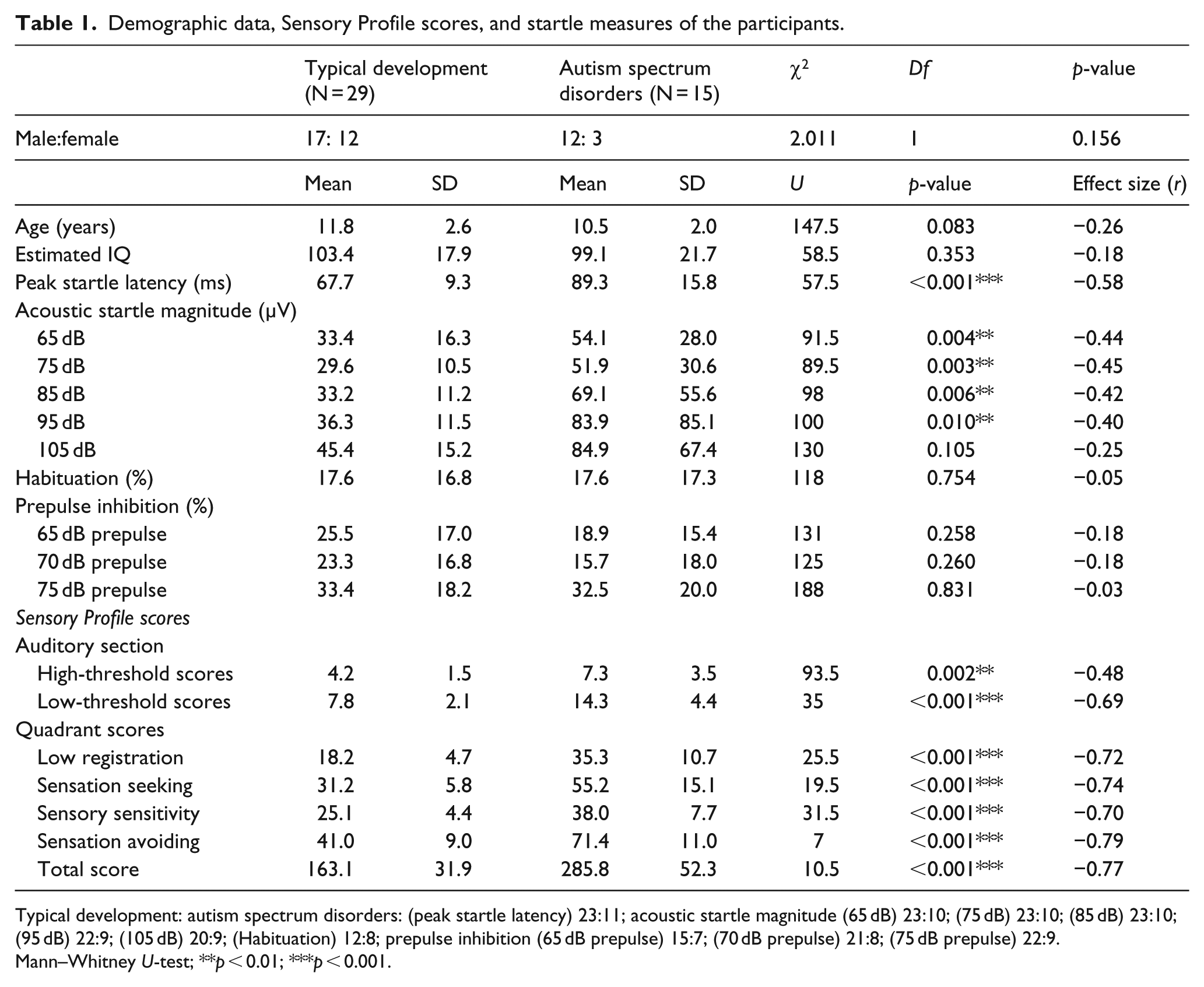 Demographic data, Sensory Profile scores, and startle measures of the participants.
