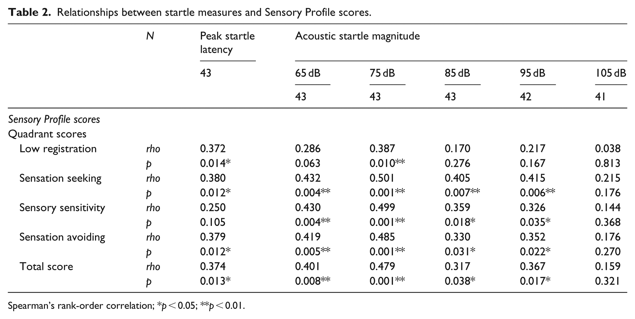 With the exception of low registration, the total SP and quadrant scores were significantly correlated with average ASR magnitude at stimulus intensities of 95 dB or lower (Table 2). Most of the relationship for ASR65 and ASR75 remained significant even after correcting for multiple comparisons. Similarly, apart from sensory sensitivity, the total SP scores and quadrants were significantly correlated with PSL (Table 2). The low-registration quadrant was also significantly related to average ASR magnitude at stimulus intensities of 75 dB. We did not find any other significant relationships of total SP and quadrant scores to startle measures.