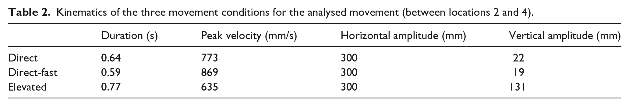 The kinematics of the demonstrator’s hand movements were also measured using Polhemus LIBERTY motion tracker during recording of the video clips, to allow a direct comparison between the demonstrator and participant imitation modulation. A single movement, between locations 2 and 4 (Figure 1(b)) was selected for kinematic and eye movement analyses. This movement was selected because this was the largest movement in the sequences, so produced more data to analyse. The hand in the video clips was recorded in three different conditions (elevated, direct and direct-fast) that differed according to the height and speed (Table 2).