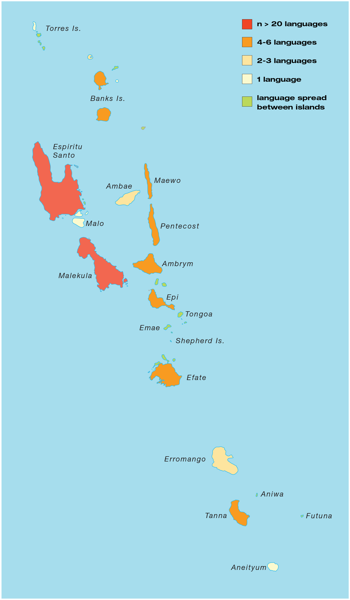 The diversity of languages in Vanuatu and the uneven distribution of those languages among the islands has led, unsurprisingly, to a diversity of linguistic situations. Each island exhibits multiple and intersecting linguistic spaces in which varying degrees of multilingualism can be observed, as we will demonstrate in this section. As will additionally be shown through our examples (see ‘Emae Island’, below), even neighboring villages with very similar linguistic contexts can maintain different multilingual situations.