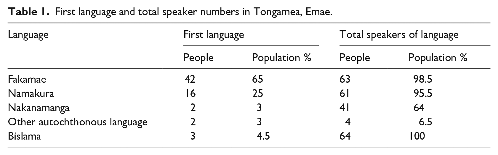 Tongamea is a half-hour walk west of Makatu. Though emigration rates are also high in this village, it has a larger population of about 113 (64 adults). Thirty-seven participants were interviewed in Tongamea. As well as recording participants’ own practices of multilingualism, these people were also asked to give an assessment of the multilingual practices of members of their household, giving a village-wide snapshot of multilingualism. Online Appendix 2 summarizes the results of this survey. It includes data for community members aged 16 years and over. As with Table 1 in Online Appendix 1, participant names have been replaced with numbers and exact ages have been replaced with ranges. This summary excludes the major languages of English and French; however, Bislama is included on the basis that a number of community members are identified as speaking this as a first language. The survey results summarized in Online Appendix 2 are further analyzed in Table 1. This table outlines the first languages of the Tongamea community, and the total numbers of languages used by this community. In this table, dual first languages are assigned one unit each. We see that the majority of the Tongamea community speak the same two local languages: 98.5% use Fakamae, and 95.5% use Namakura. Nakanamanga is also used, though by only 64% of the community.