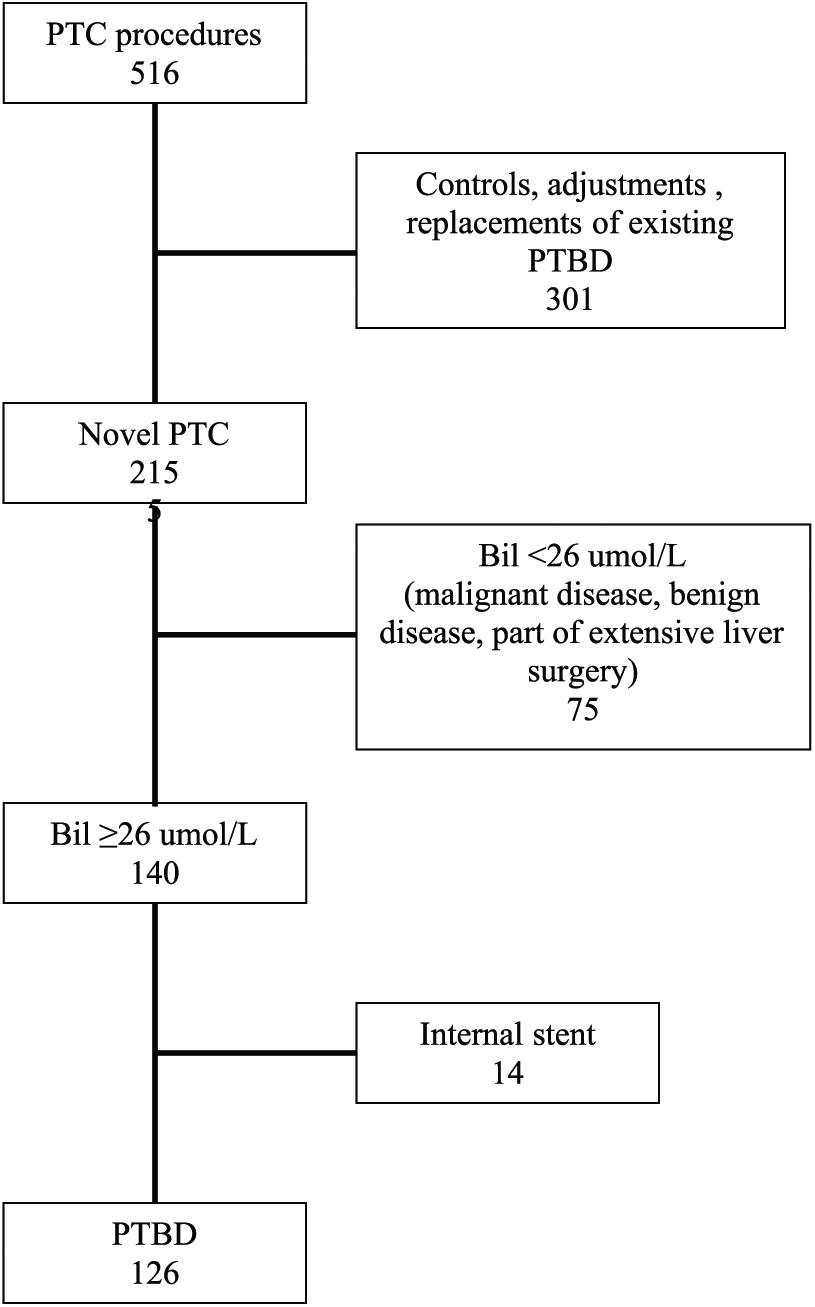 Flow chart showing the number of patients undergoing percutaneous transhepatic cholangiography (PTC) from June 2010 to June 2013, and how 126 patients with permanent external drainage (PTBD) and 14 patients with temporary external drainage and later internal drainage became included in the study.