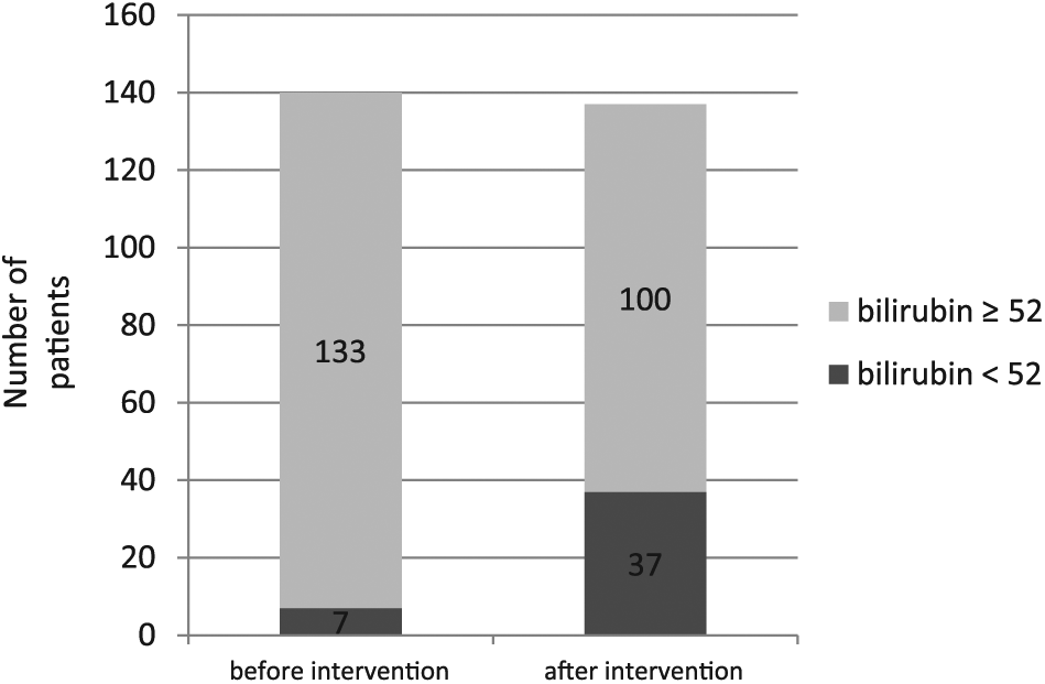 Bilirubin in plasma before PTBD (left column) and after PTBD (right column). Gray color depicts number of patients with a bilirubin value of ≥52 µmol/L and black color a value of <52 µmol/L. Three patients are missing in the bar showing bilirubin after PTBD.