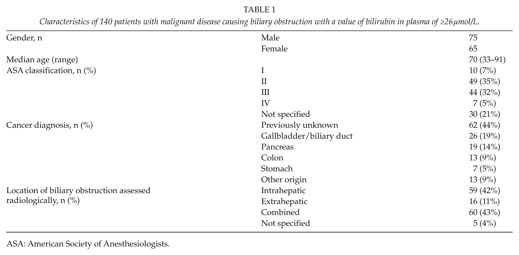 Characteristics of 140 patients with malignant disease causing biliary obstruction with a value of bilirubin in plasma of ≥26 µmol/L.