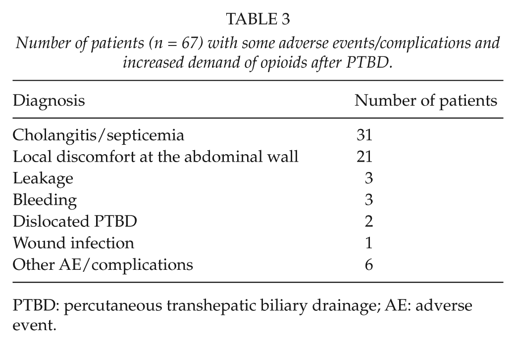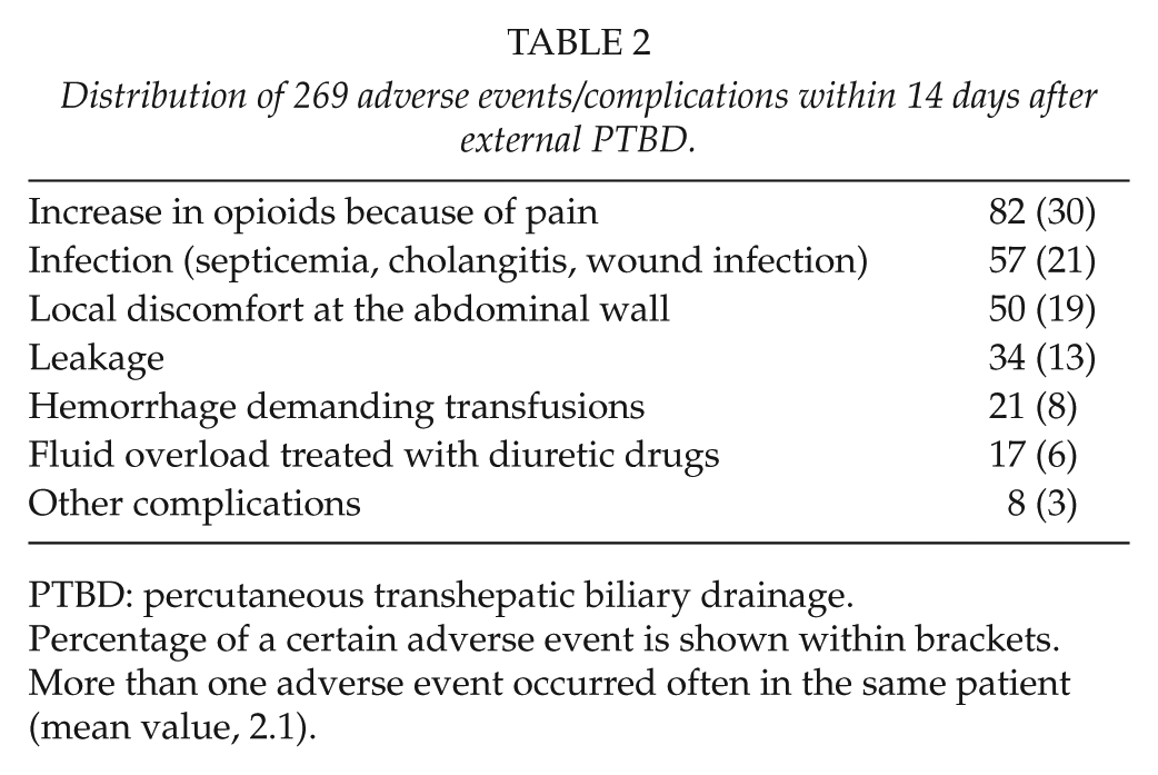 Some 269 adverse events (AE/complications) were documented. Most common were pain demanding increased dose of opioids, local discomfort, and cholangitis/septicemia (Table 2).