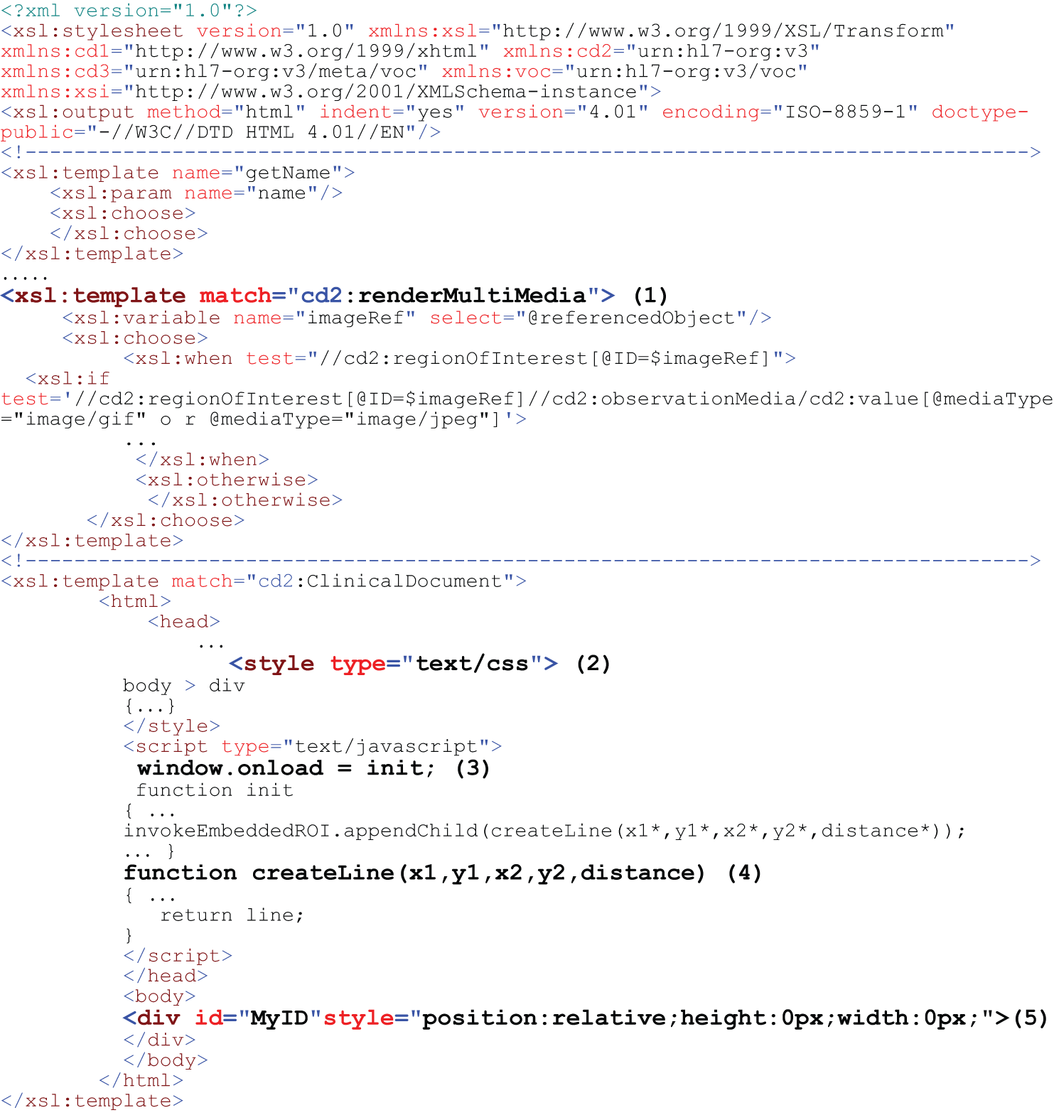 As mentioned in the previous section, the XSLT style sheet is used to support the rendering of the CDA contents and the embedded shapes of ROIs. In this section, we will describe the design that satisfies the above considerations.