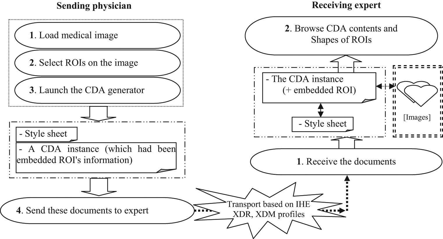 On the sending side, when the doctor has finished performing the first three steps by using the image-processing tool and launching CDA Generator, the doctor will take the CDA document and the corresponding XSLT style sheet and will send these documents to the receiving doctor by any standard transport scheme, such as IHE XDR or XDM profiles. 10