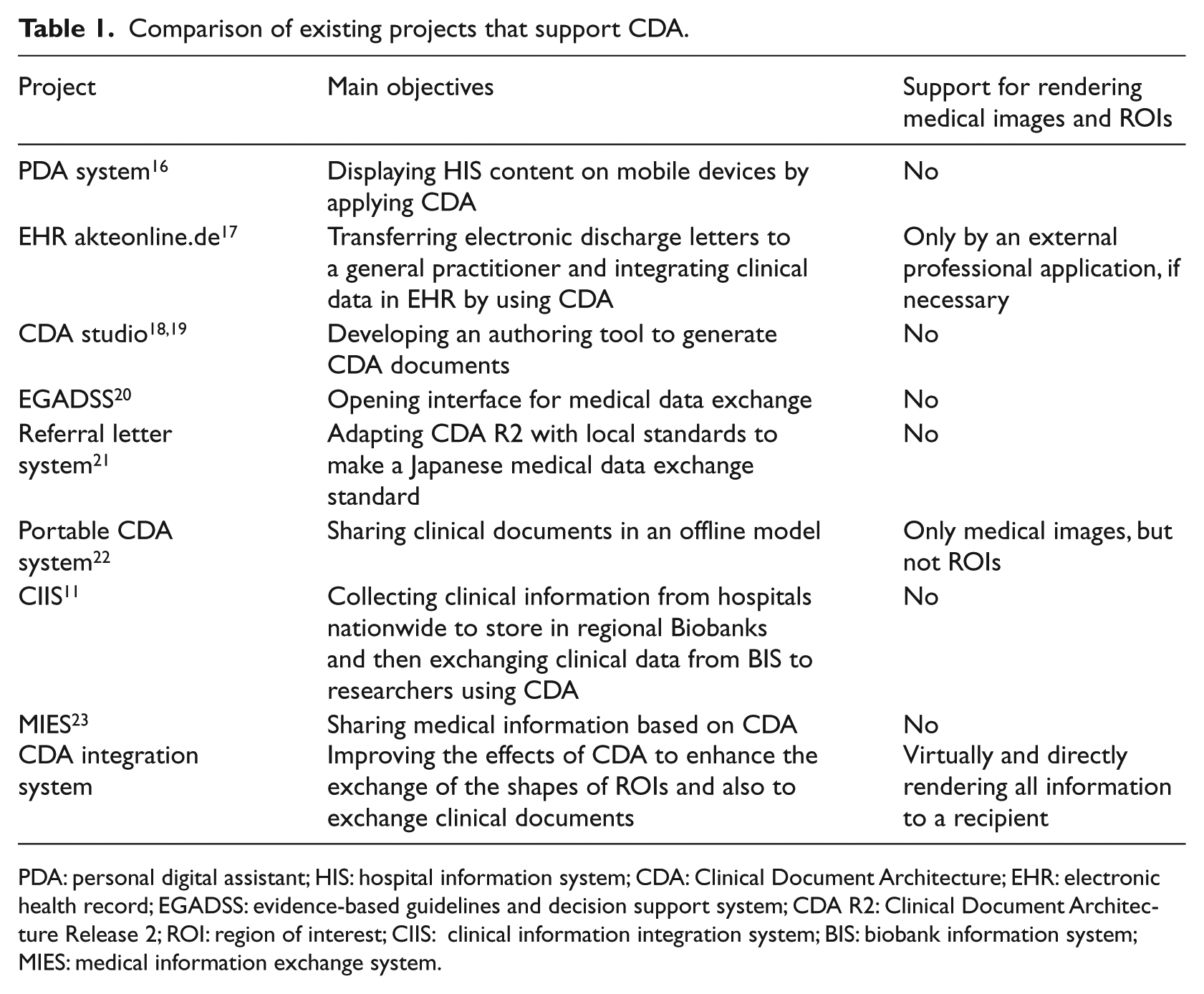 The comparison between our approach and other systems in terms of the main objectives and the support for rendering medical images and ROIs is summarized in Table 1. Our approach has several advantages over existing methods: (a) Clinical data are encoded by using an international standard—CDA R2. Therefore, clinical documents are compatible with any existing application that supports CDA so the recipient does not need to upgrade the application. (b) Minimal change in existing CDA generators is required, in that only the function for generating the