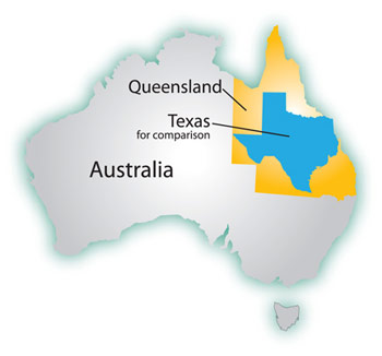Comparative size of the State of Queensland, Australia, to Texas, USA. 24