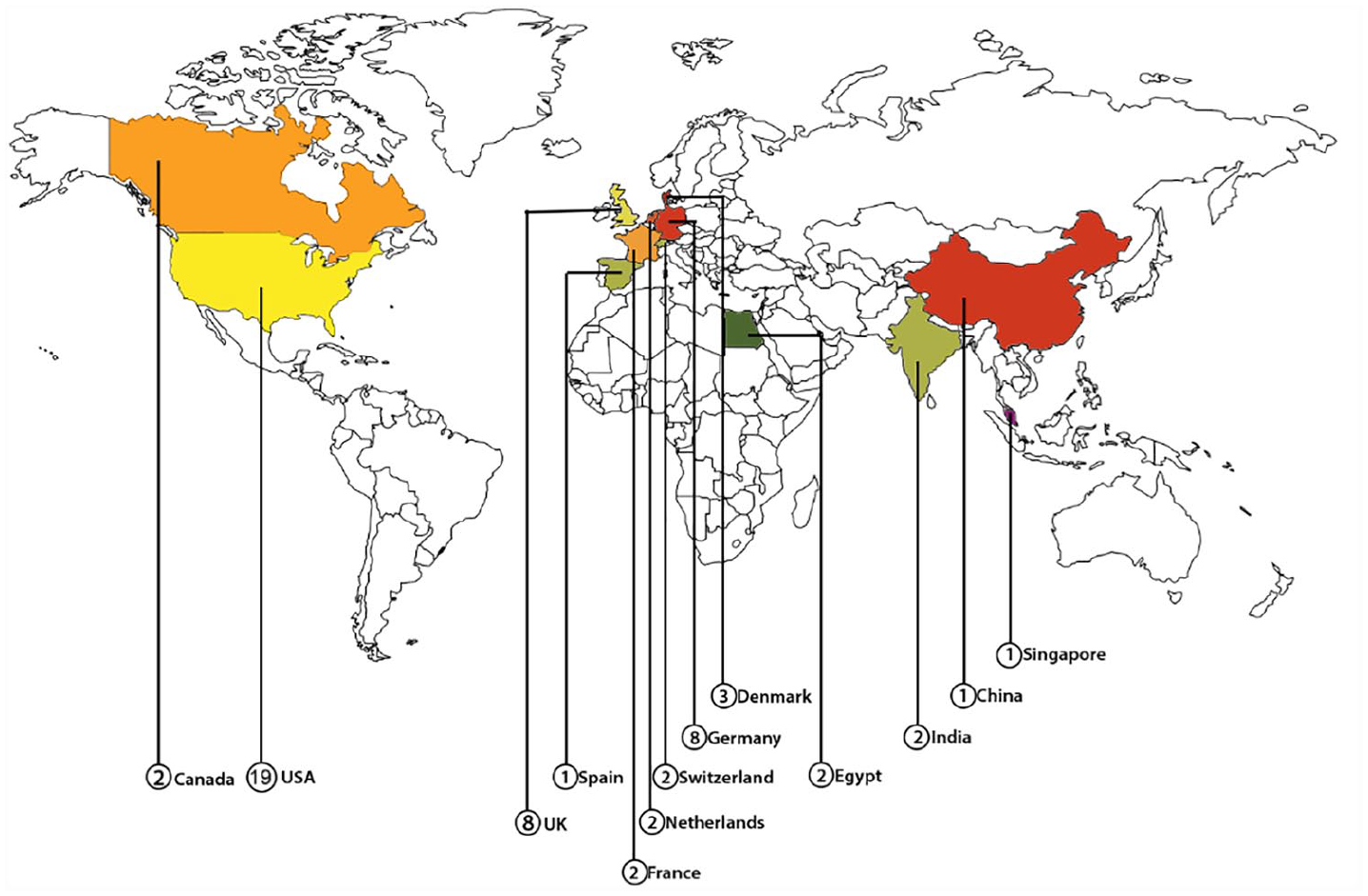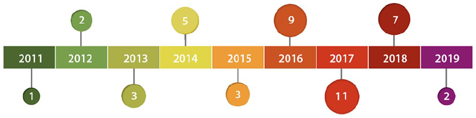 Figure 2 shows the publishing year of the selected studies. Figure 3 shows the number of institutions per origin country of the studies.