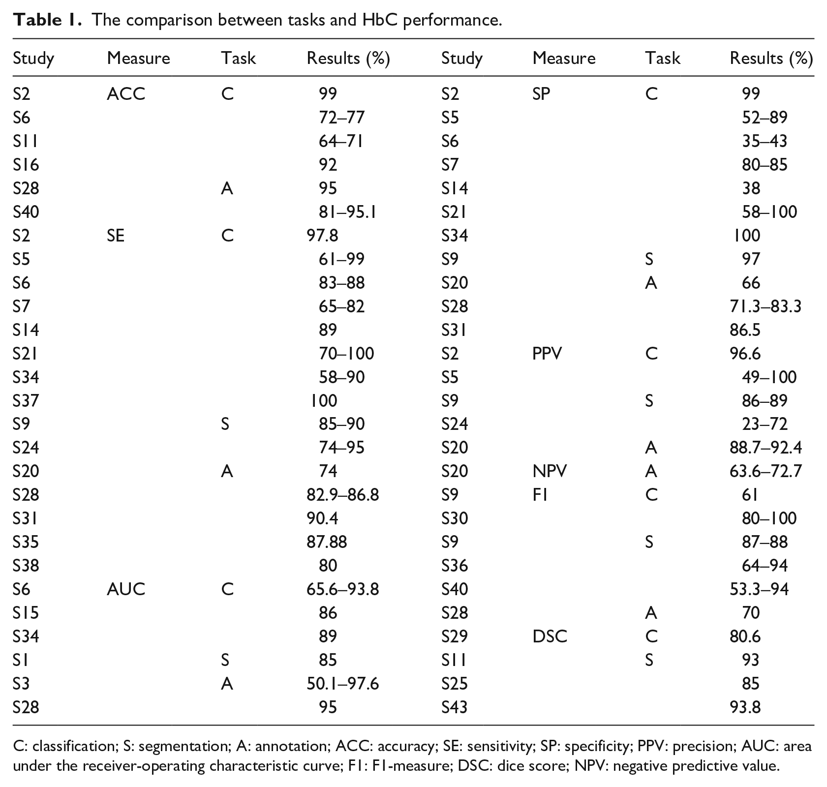 C: classification; S: segmentation; A: annotation; ACC: accuracy; SE: sensitivity; SP: specificity; PPV: precision; AUC: area under the receiver-operating characteristic curve; F1: F1-measure; DSC: dice score; NPV: negative predictive value.
