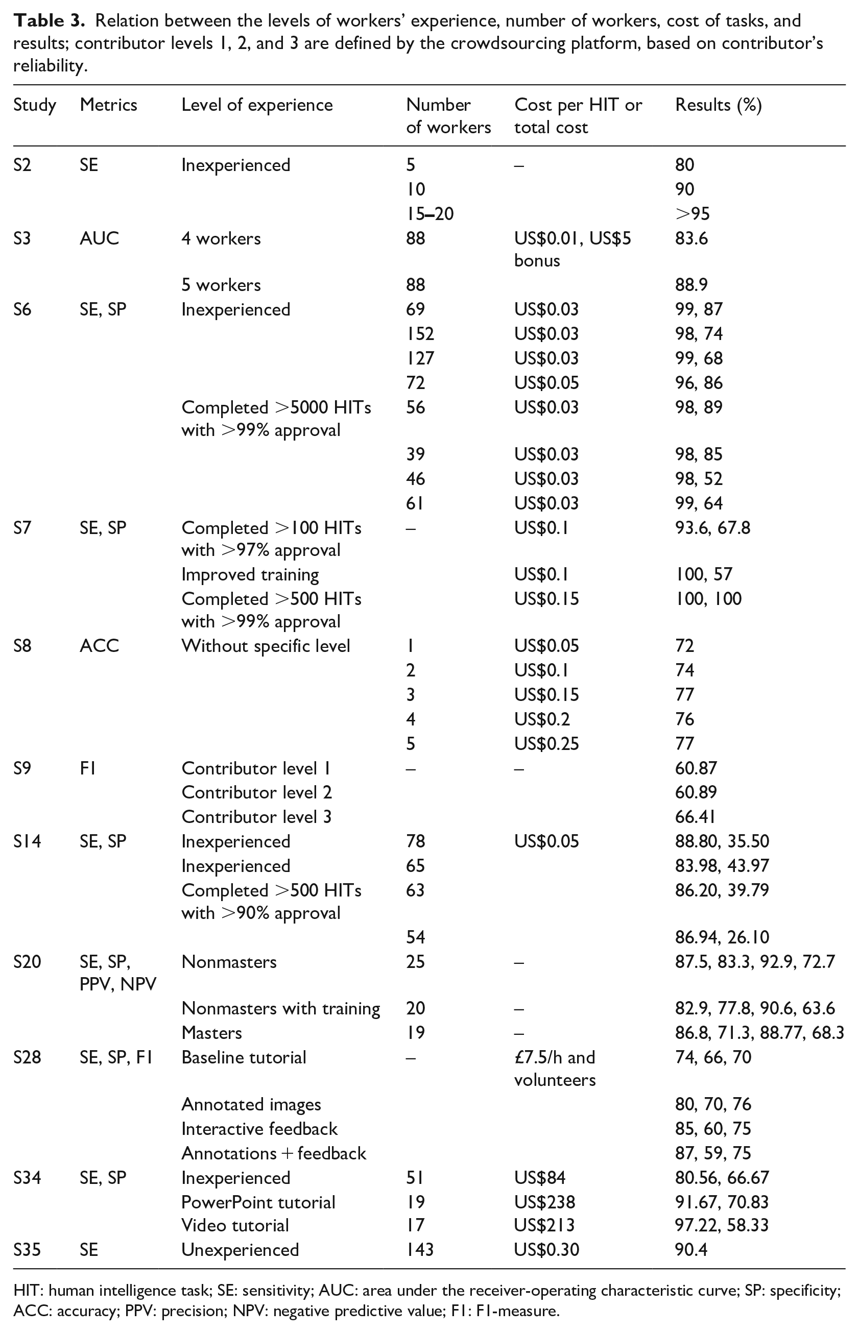 The total time of running the total number of tasks can vary. These times can be less than 24 h (S6, S5, S10, S11, S14, S16, and S34), approximately 2 weeks (S4 and S34) or a month (S8). From the total cost, we found that the cheapest experiment cost is US$1.21 (S19) for 22 workers. S27 shows that the cost of image labeling and nuclei labeling significantly differ because of the number and difficulty of the task. Therefore, they paid US$282 for image labeling and US$2820 for nuclei labeling. The first task required 4 h and the second 472 h to finish. S33 shows that training renders the workers more reliable, but consumes more time and money. Without training, 51 workers were paid US$84 for the total time of 40 min; with PowerPoint training, 19 workers were paid US$238 for 28 h; and with video training, 17 workers were paid US$213 for 18 days of work. Furthermore, S30 obtained acceptable results with a total cost of US$388.80 for 150 workers of 40 images. The cost of 1 HIT ranges between US$0.01 and US$0.50 in all studies, thereby rendering the crowdsourcing HbC systems highly cost-efficient.