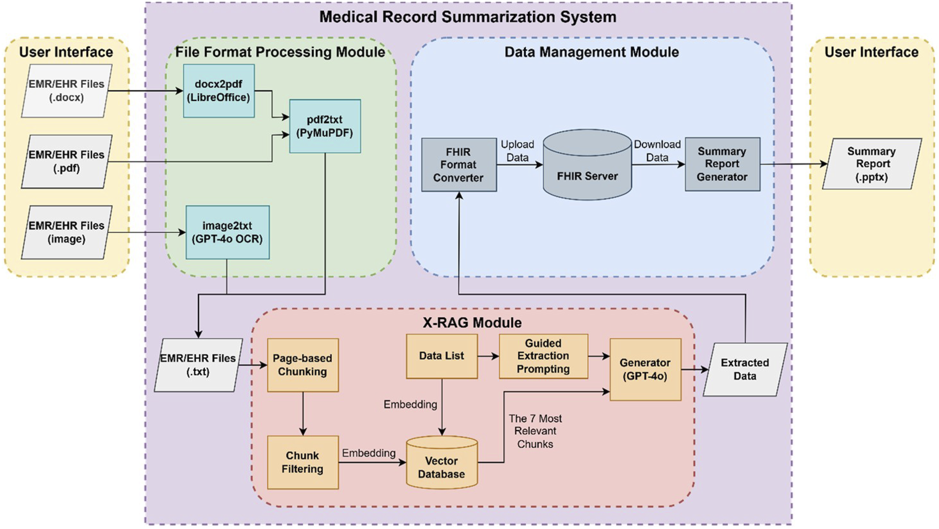 The overall architecture of the system is shown in Figure 1. Each module is responsible for a specific task. First, the file format processing module converts various formats of EHR and EMR files (including .docx, .pdf, and images) into plain text format. Next, the X-RAG module extracts medical measurement data, diagnostic reports, and medication history records from the converted texts. Finally, the data management module uploads the extracted data to a local FHIR server for storage and generates a summary report to assist doctors in clinical decision-making. The architecture of the system.