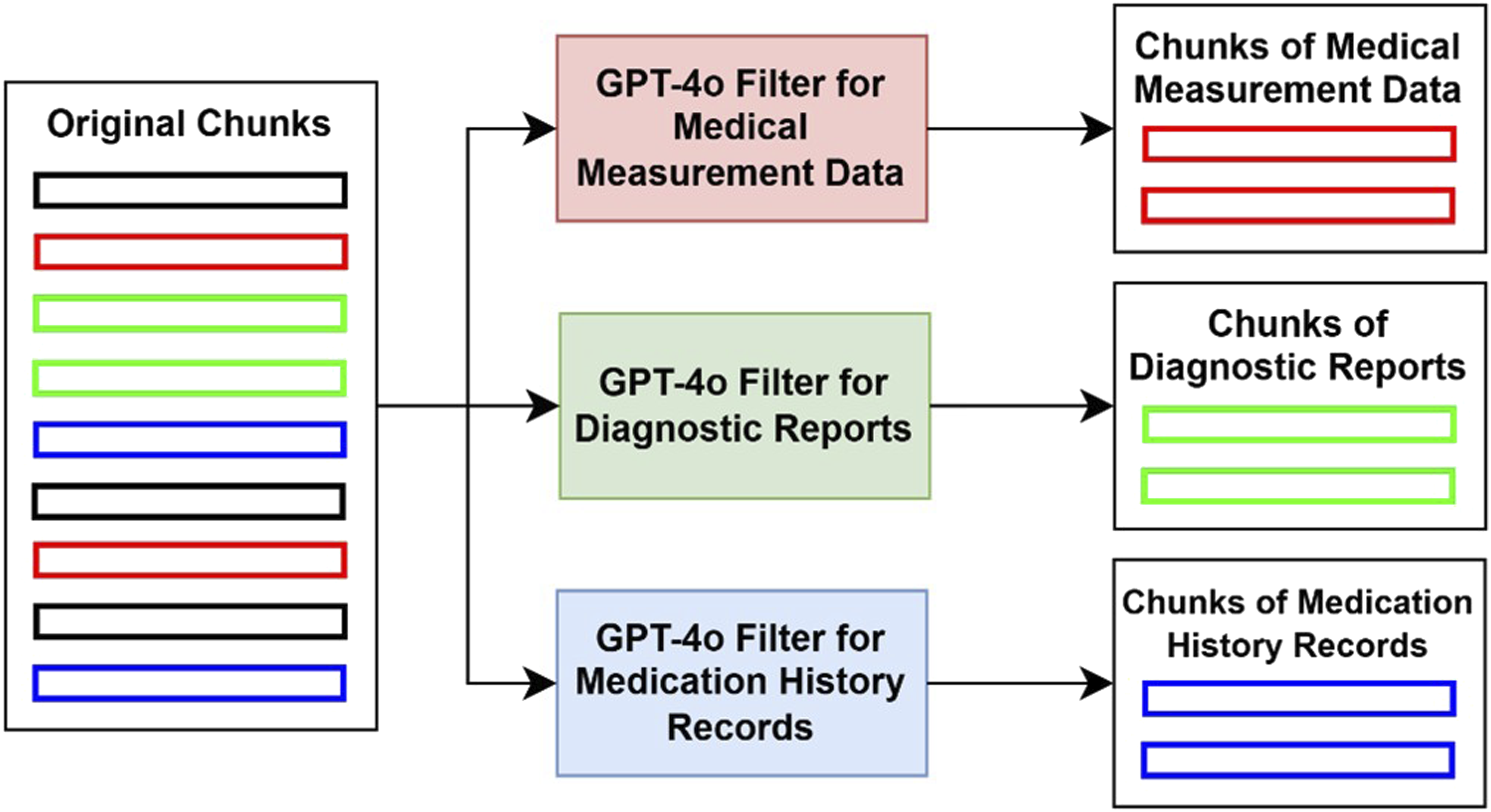 Medical records often contain a lot of irrelevant content, such as administrative information or other redundant descriptive text, which may affect the retrieval accuracy. To address this issue, we use GPT-4o as a filter to remove chunks that are irrelevant to the target information by analyzing semantics. The filtering process is conducted separately for medical measurement data, diagnostic reports, and medication history records, ensuring that each dataset contains only the relevant and valid information. After chunk filtering, we obtain three refined datasets corresponding to medical measurement data, diagnostic reports, and medication history records (Figure 2). Chunk filtering illustration. (Red: Chunks of medical measurement data, Green: Chunks of diagnostic reports, Blue: Chunks of medication history records, Black: Irrelevant chunks).