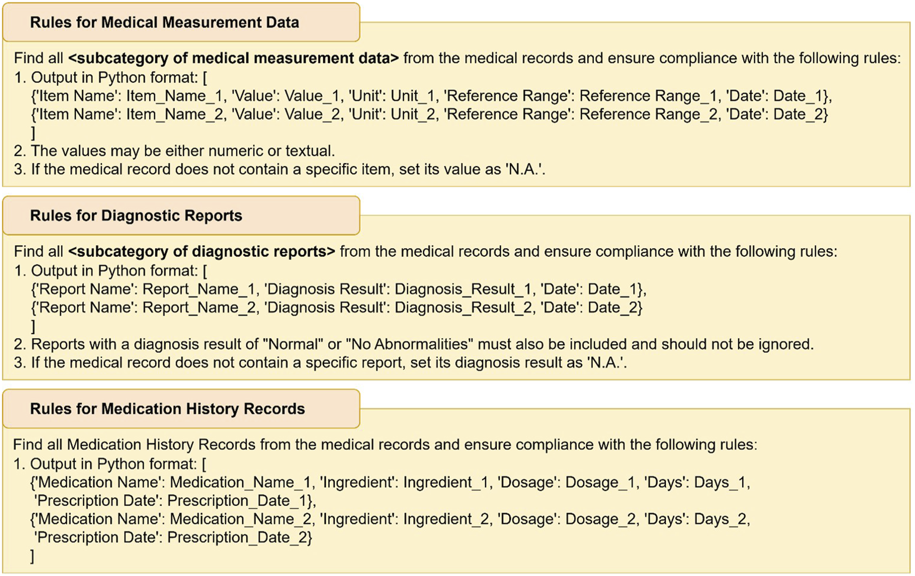 and tailored examples are designed for each subcategory. By combining rules and examples, GPT-4o can better understand the requirements for information extraction, ensuring content generation accuracy and format consistency. Rules for medical measurement data, diagnostic reports, and medication history records.