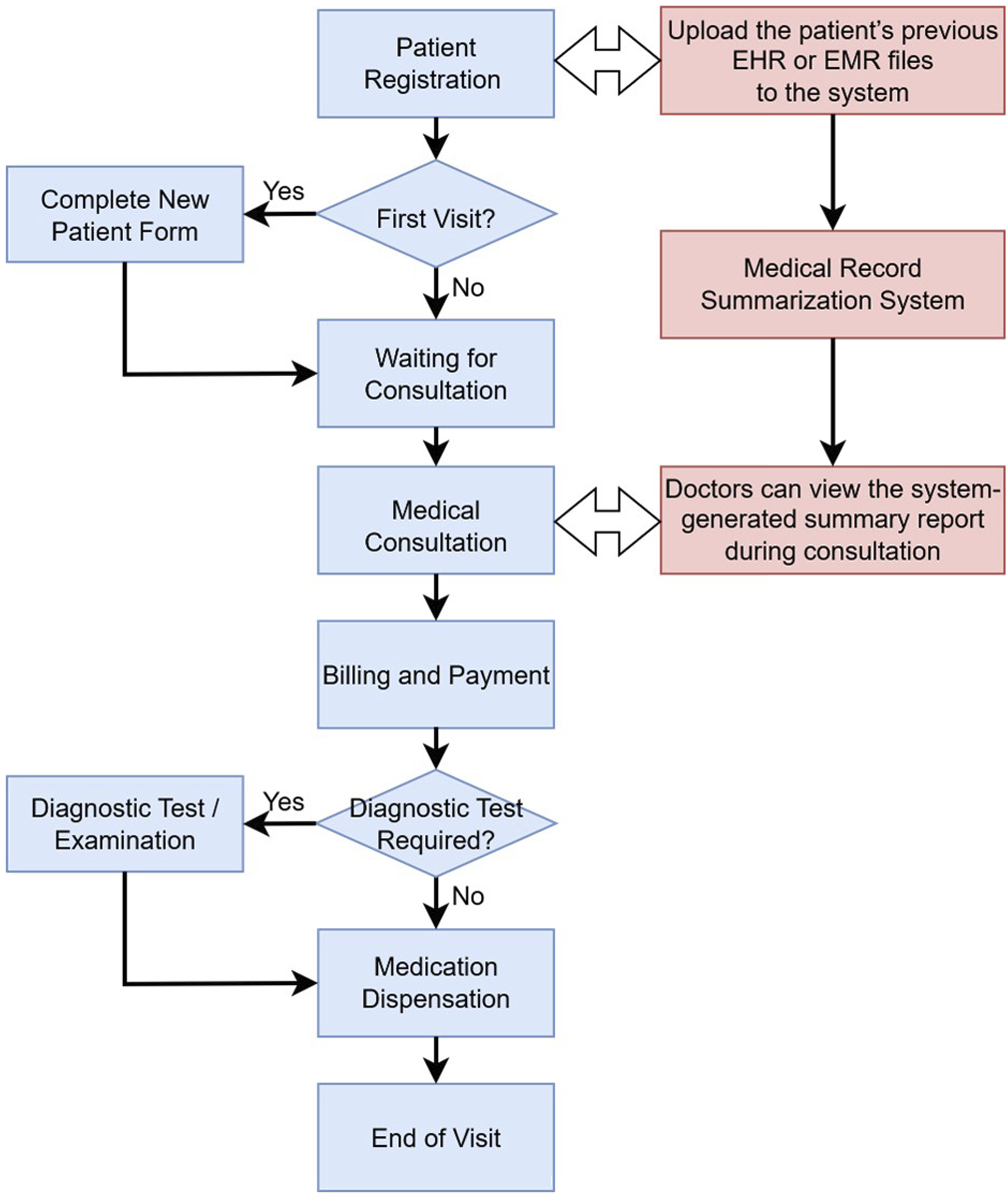 Figure 4 illustrates how the Medical Record Summarization System developed in this study is integrated into the outpatient visit workflow. During patient registration, front desk staff or nurses upload the patient’s previous EHR or EMR files to the system. The system is automatically activated and generates a patient summary report that includes medical measurement data, diagnostic reports, and medication history records, assisting doctors in quickly understanding the patient’s condition during consultations. The outpatient visit workflow (in blue) integrated with our Medical Record Summarization System (in red).