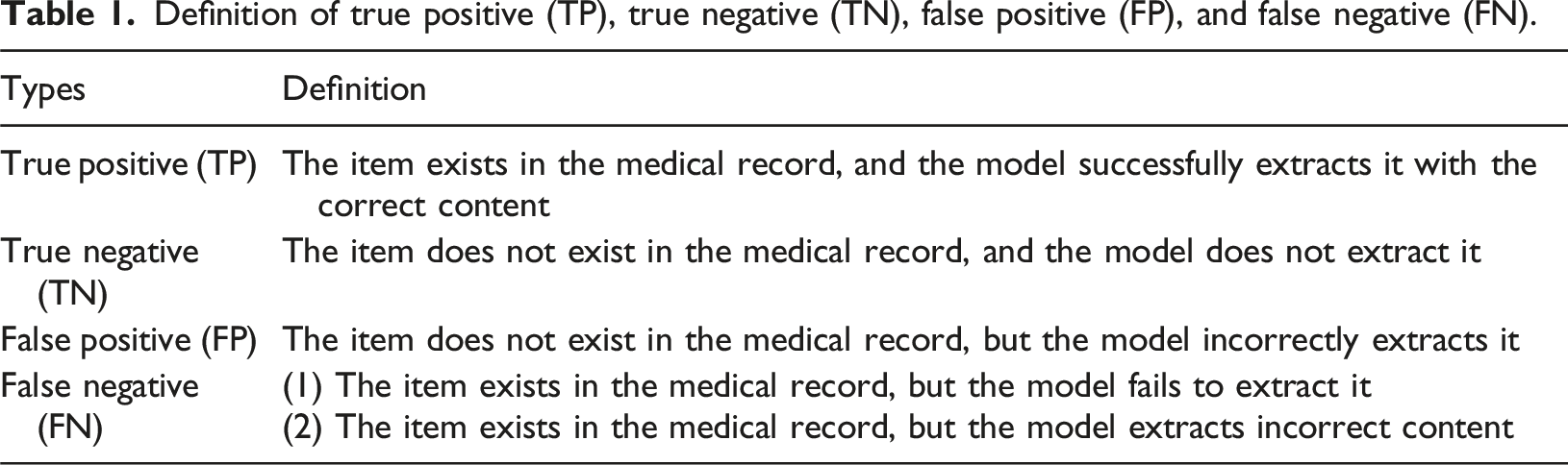In clinical decision-making, it is crucial to avoid both incorrect extraction and omission of critical information. Therefore, the F1 score, as a comprehensive metric that balances Precision and Recall, is suitable for evaluating the overall performance of medical information extraction tasks and is widely adopted in related studies.10–12