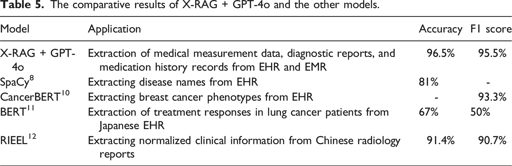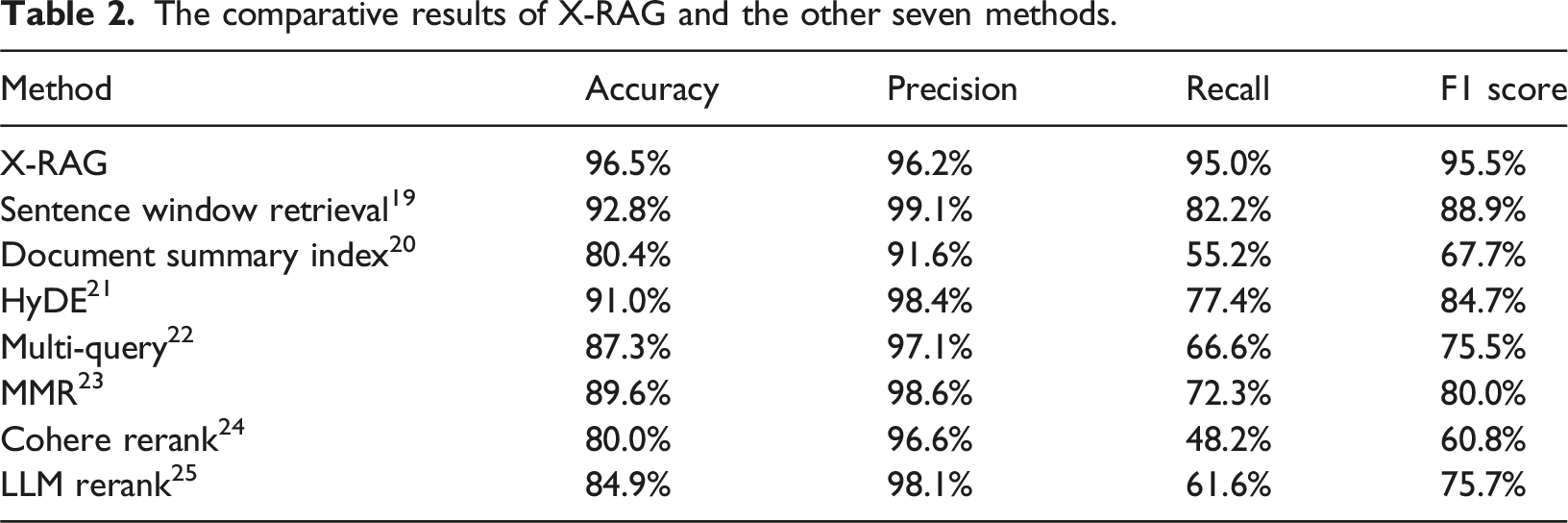 To evaluate the performance of the proposed X-RAG technology in extracting medical data from EHR and EMR, we compared it with seven RAG methods. These methods encompass commonly used and representative design strategies in current RAG systems, focusing on different aspects of optimization, including enhancing retrieval precision with Sentence Window Retrieval 19 and Document Summary Index 20 ; expanding the retrieval scope with HyDE 21 and Multi-query 22 ; and improving result diversity and ranking quality with MMR, 23 Cohere Rerank, 24 and LLM Rerank. 25