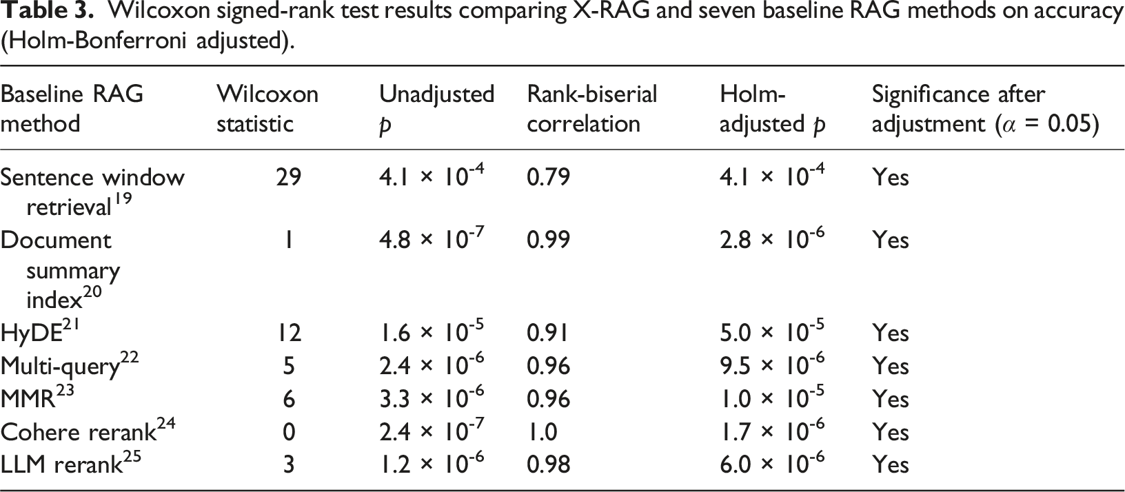 Wilcoxon signed-rank test results comparing X-RAG and seven baseline RAG methods on accuracy (Holm-Bonferroni adjusted).