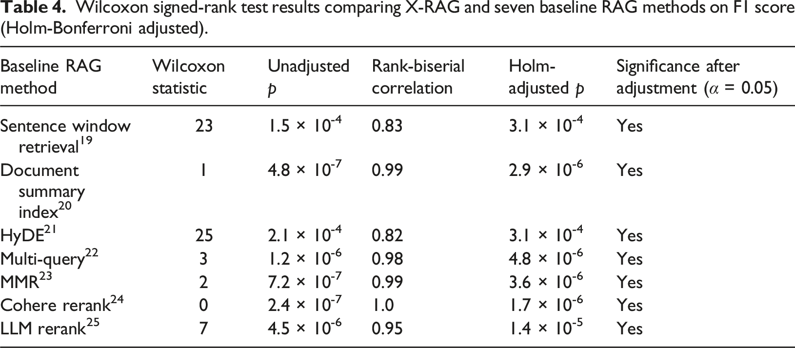 Wilcoxon signed-rank test results comparing X-RAG and seven baseline RAG methods on F1 score (Holm-Bonferroni adjusted).
