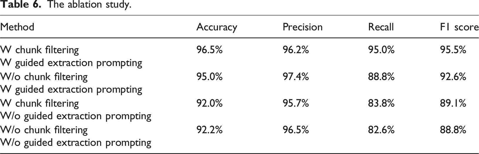Overall, the ablation study confirms the complementarity between Chunk Filtering and Guided Extraction Prompting. Chunk Filtering enhances recall, while Guided Extraction Prompting improves overall accuracy and the F1 score. Therefore, the optimal strategy is to integrate both techniques to achieve the best performance in medical information extraction.