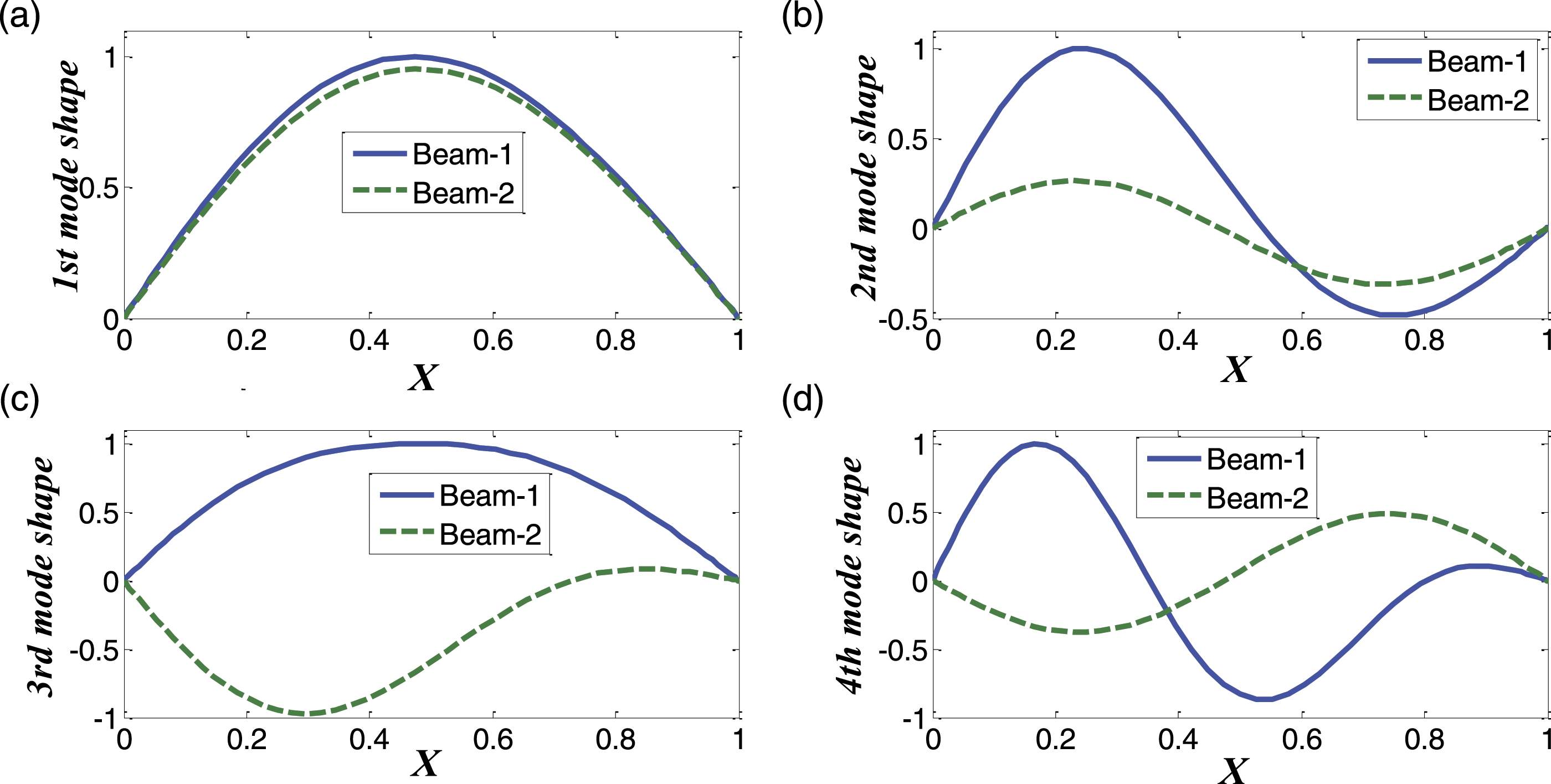 First six frequencies (rad/s) for two parallel prismatic and isotropic Euler–Bernoulli beams with different boundary conditions (