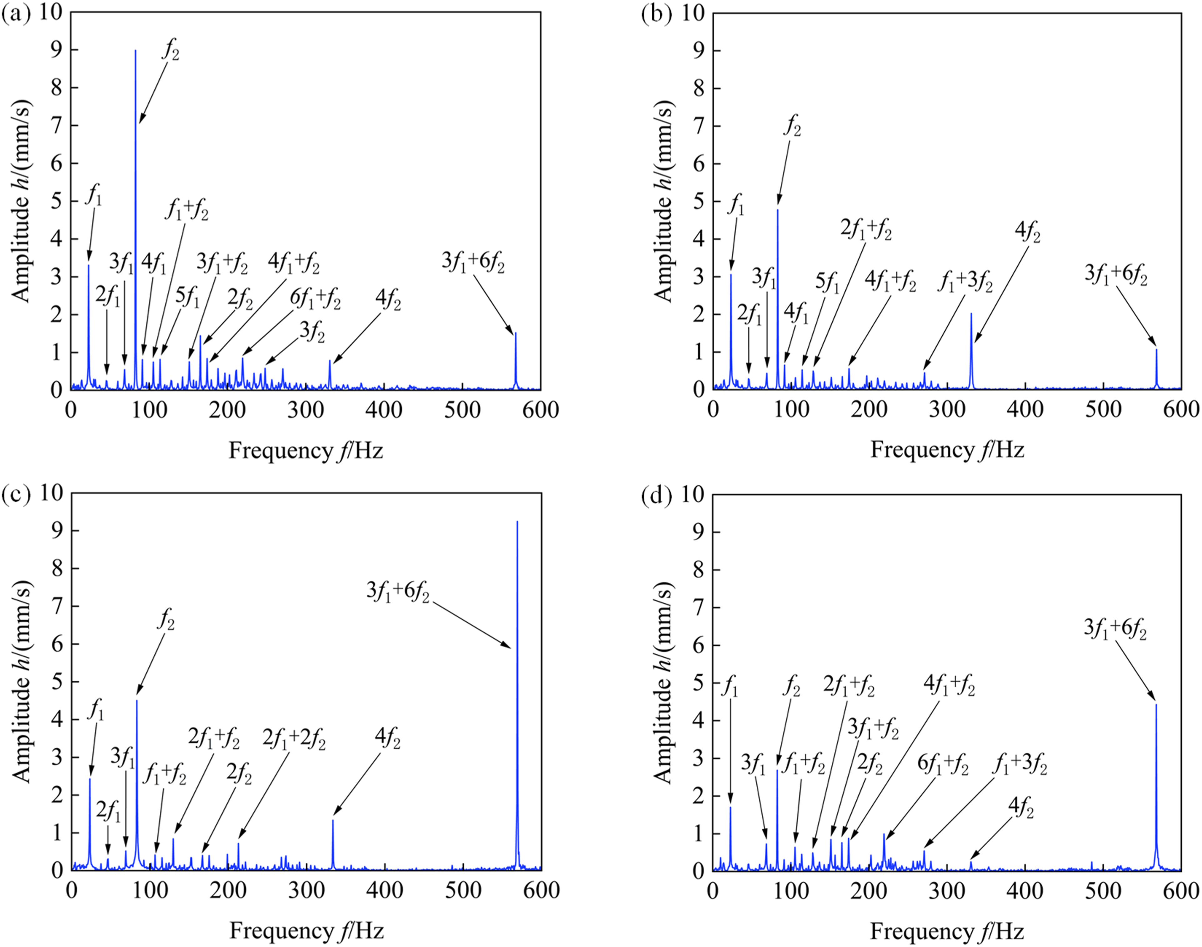 In order to analyze the frequency characteristics before and after the engine fault more specifically, four horizontal measuring points Vibration spectrum diagrams of four horizontal measuring points at the beginning of fault. (a) Vibration spectrum diagrams of four horizontal measuring points with severe fault. (a)