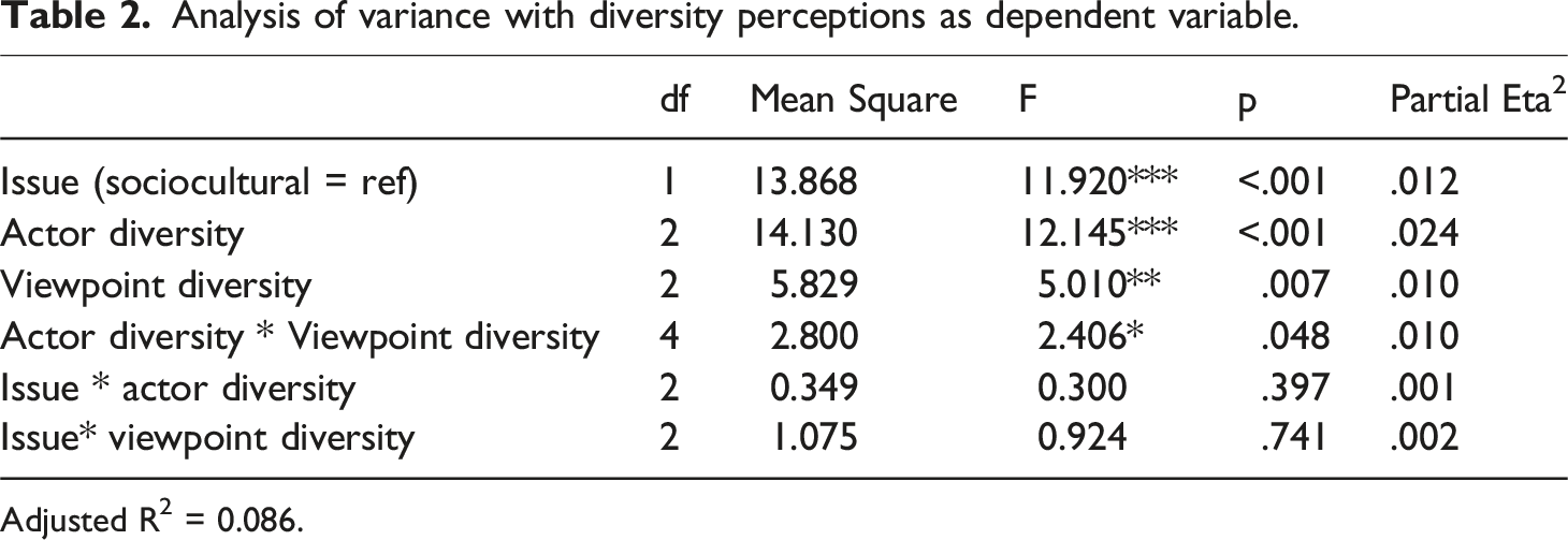 Our first analysis to test whether audiences in the first place notice diversity, consisted of a two-way independent ANOVA with the experimental manipulations (actor and viewpoint diversity) as independent variables, and diversity perceptions as dependent variable, followed by Bonferroni post-hoc tests.