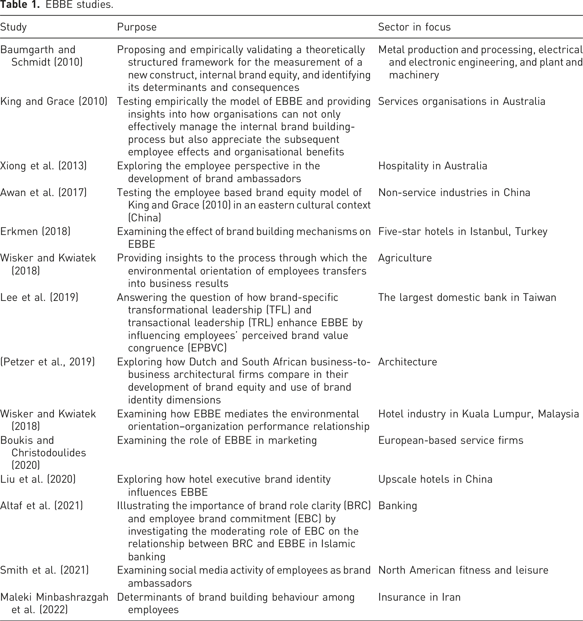 King and Grace (2009) first conceptualised EBBE to describe how employees can transfer their understanding and perception of a brand to customers. This conceptualisation suggests that, for services industries, the construction of a brand primarily emerges from the internal rather than the external environment (De Chernatony et al., 2006). The features of service products include intangibility, perishability, and heterogeneity (Rodríguez-López et al., 2020); thus, the process of developing a service brand is different from that for non-services (De Chernatony and Segal-Horn, 2001).