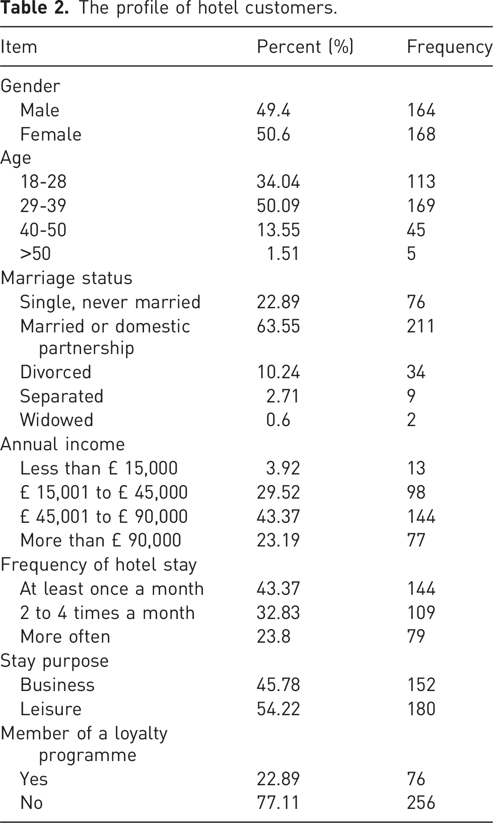The data were analysed in SPSS 28 software. When evaluating the credibility of research, reliability and validity need to be ensured (Elo et al., 2014). The following methods were selected for data analysis. First, descriptive statistics were used to summarise the demographic information of respondents including gender, age, work department (in the case of hotel employees), for example. Second, reliability and validity were tested by measuring internal consistency. Then, correlation analysis and linear regression analysis were employed to evaluate the influence of independent variables on dependent variables. Finally, the analysis of variance (ANOVA) was used to test the difference among variables.