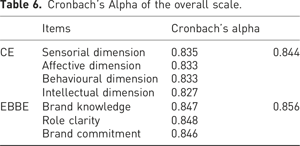 For the EBBE section of the questionnaire, 18 questions were presented to examine BK, RC and BC of hotel employees. BK was measured with five items from Baumgarth and Schmidt (2010) and Ambler (2013). RC was measured with six items from Mukherjee and Malhotra (2006) and King and Grace (2010). BC was measured with seven items from Baumgarth and Schmidt (2010) and Punjaisri et al. (2009). For the CE section of the questionnaire, 12 questions were presented to measure the four dimensions of CE (sensorial, affective, behavioural, and intellectual). Each dimension was measured with three items from Manthiou et al. (2015). Copies of the research instruments are provided in Supplementary materials (Appendix 1 and Appendix 2).