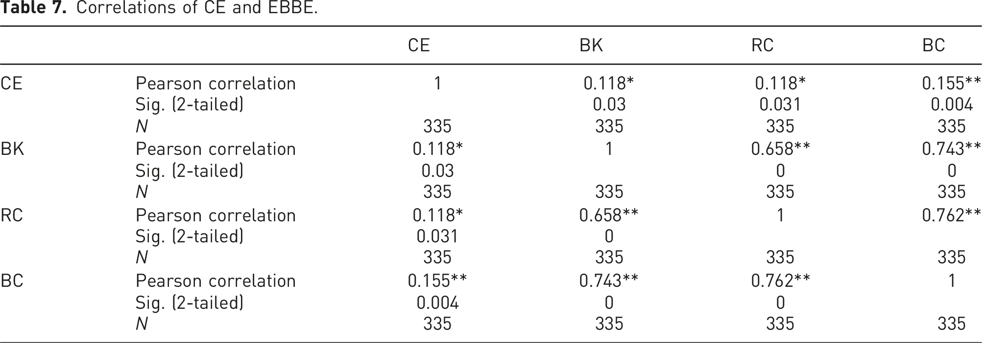 Correlations of CE and EBBE.