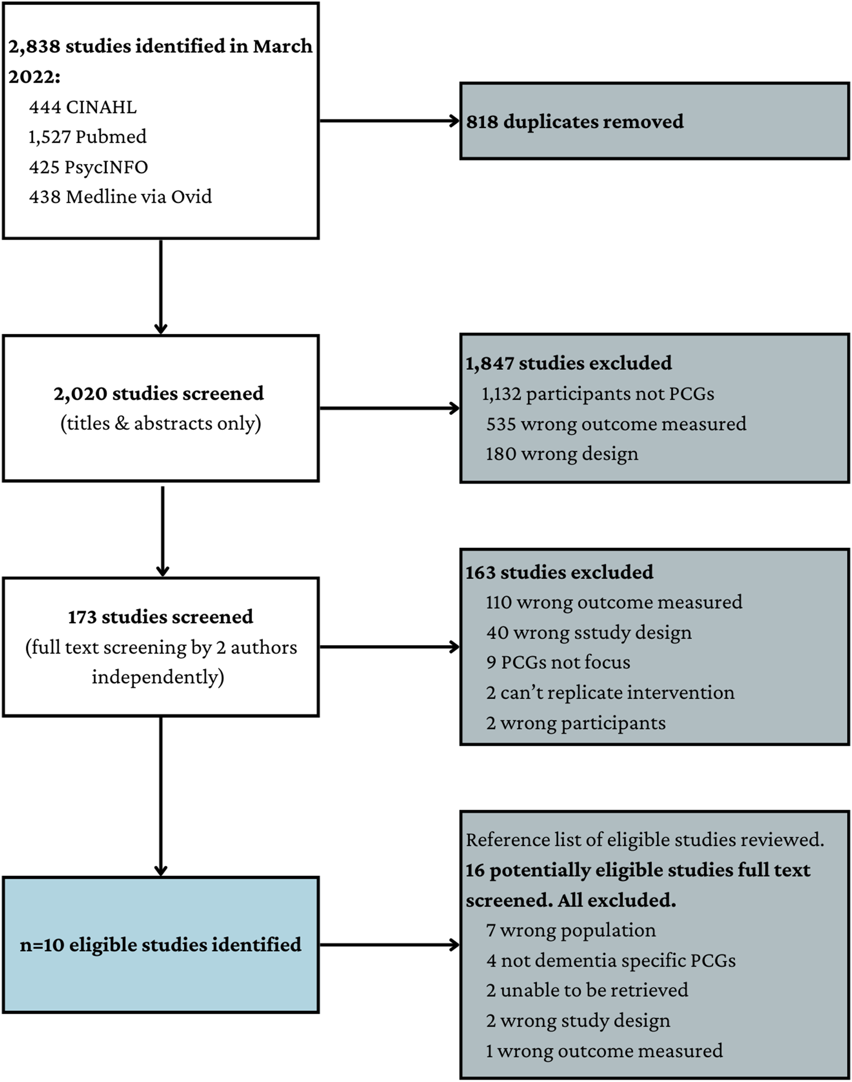 Database searches were conducted on 29th March 2022. A total of 2,838 references were retrieved and 818 duplicates were removed, resulting in a library of 2,020 unique studies. After screening against the eligibility criteria independently by two reviewers, 10 studies met all inclusion criteria and were included in the review (Figure 2). Studies were primarily excluded because they focused on family caregivers or persons with dementia outcomes only or utilised an ineligible study design. Inter-rater agreement was high (κ = .936, SE = .026, 95% CI = .885 – .987). Manual citation checking revealed 16 additional studies that possibly met the eligibility criteria; however, all were excluded upon full text review. In total, 10 studies were eligible for inclusion in the review. PRISMA flow diagram of study screening and selection.