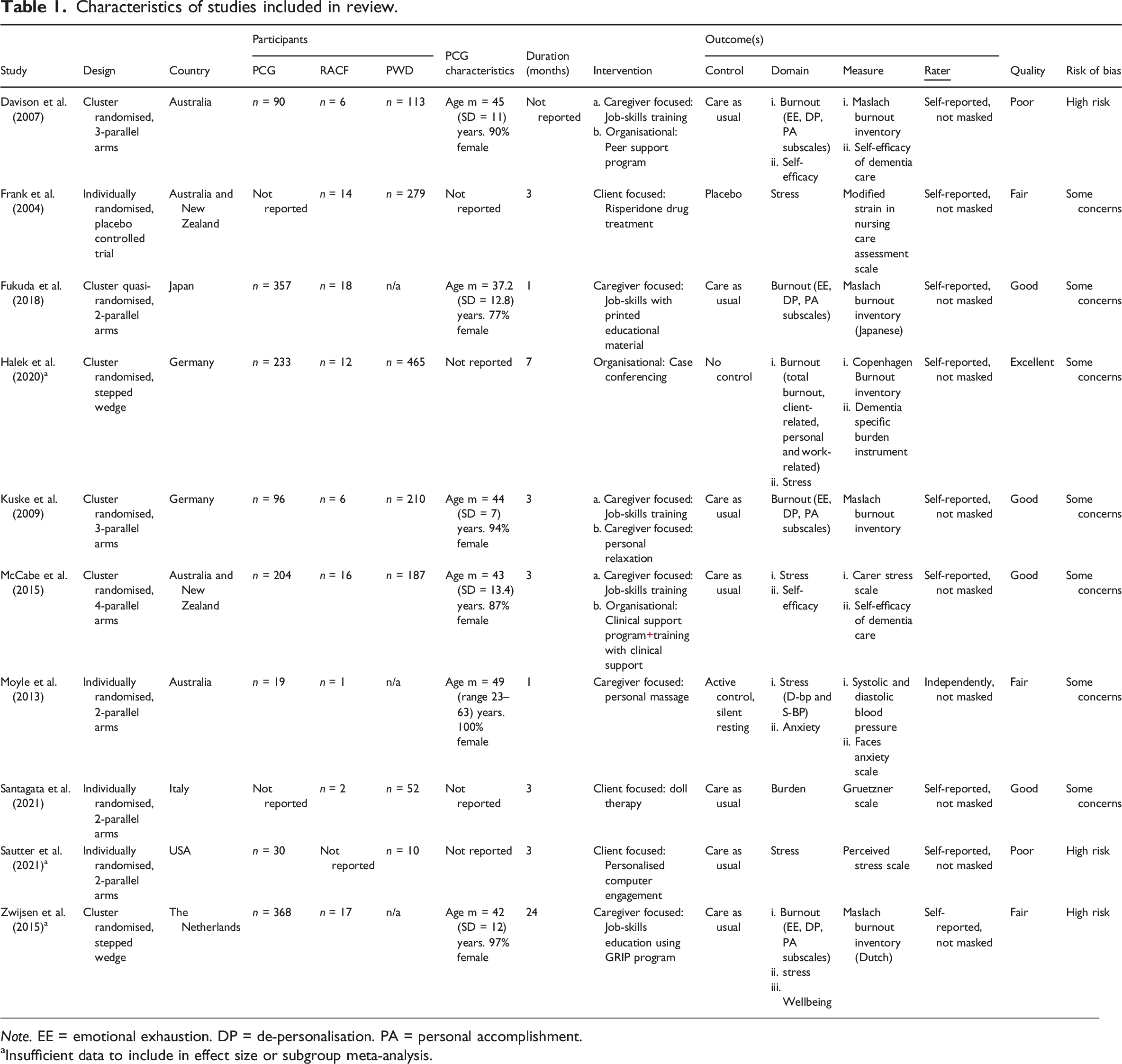 Professional caregivers were considered paid employees working at RACFs (not client family members) who do not appear to have a nursing or allied health qualification and are primarily responsible for supporting people with dementia with their activities of daily living including personal care. Studies were included where >50% of the participants met these criteria. We excluded studies that: were review studies; were not randomised controlled trial design; did not provide a sufficient description of the intervention to allow replication; or measured non-work-related anxiety and/or depression.