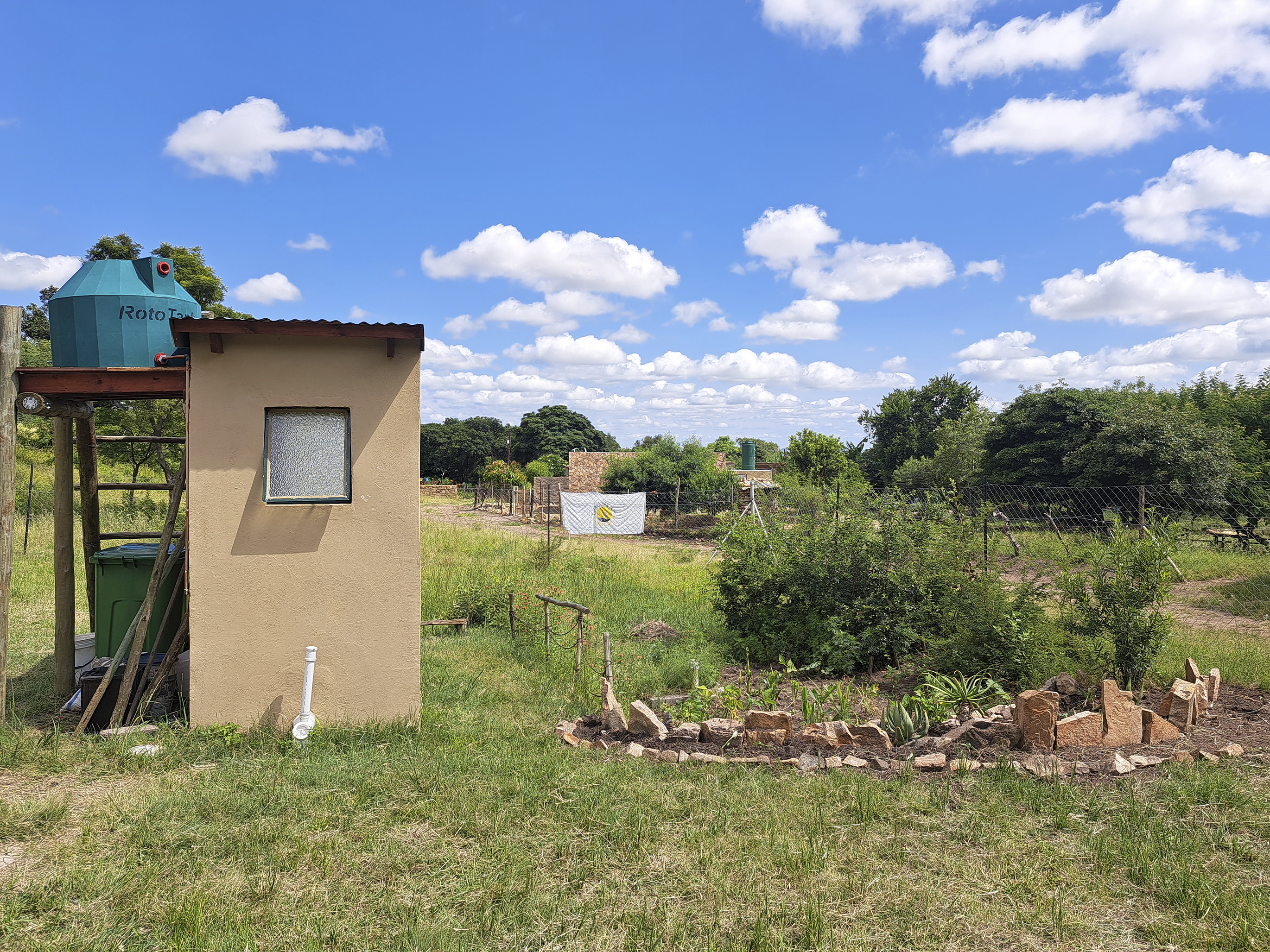 Four rangers from the Majakaneng area in North West Province played an active role in the training sessions, frequently sharing stories of the spiritual use, biodiversity and pristine water found in a ravine, known locally as a kloof, bordering their community. Their enthusiasm prompted the author and the coordinator of the MB_NPC to visit the Majakaneng kloof and a second successful funding application (UNESCO, 2021), enabled the development of a 10 km hiking trail through the kloof and onto the mountain plateau. During this period, the Majakaneng group began referring to themselves as Rangers in Mission, signalling their distinct identity and purpose within the broader MBR. The grant also funded a 20-year lease on a disused homestead at the start of the kloof, which was converted into a base camp. It consists of a shaded outdoor lecture area with interpretive signage (Image 1), an indigenous plant garden, a display of artefacts, secure parking and a toilet connected to a septic tank (Image 2). The Majakaneng hiking trail base camp lecture area with interpretive signage on biomes and cultural heritage provides space for discussion and refreshments The base camp is fenced, equipped with a flush toilet connected to a septic tank and features an indigenous, low-water-use garden