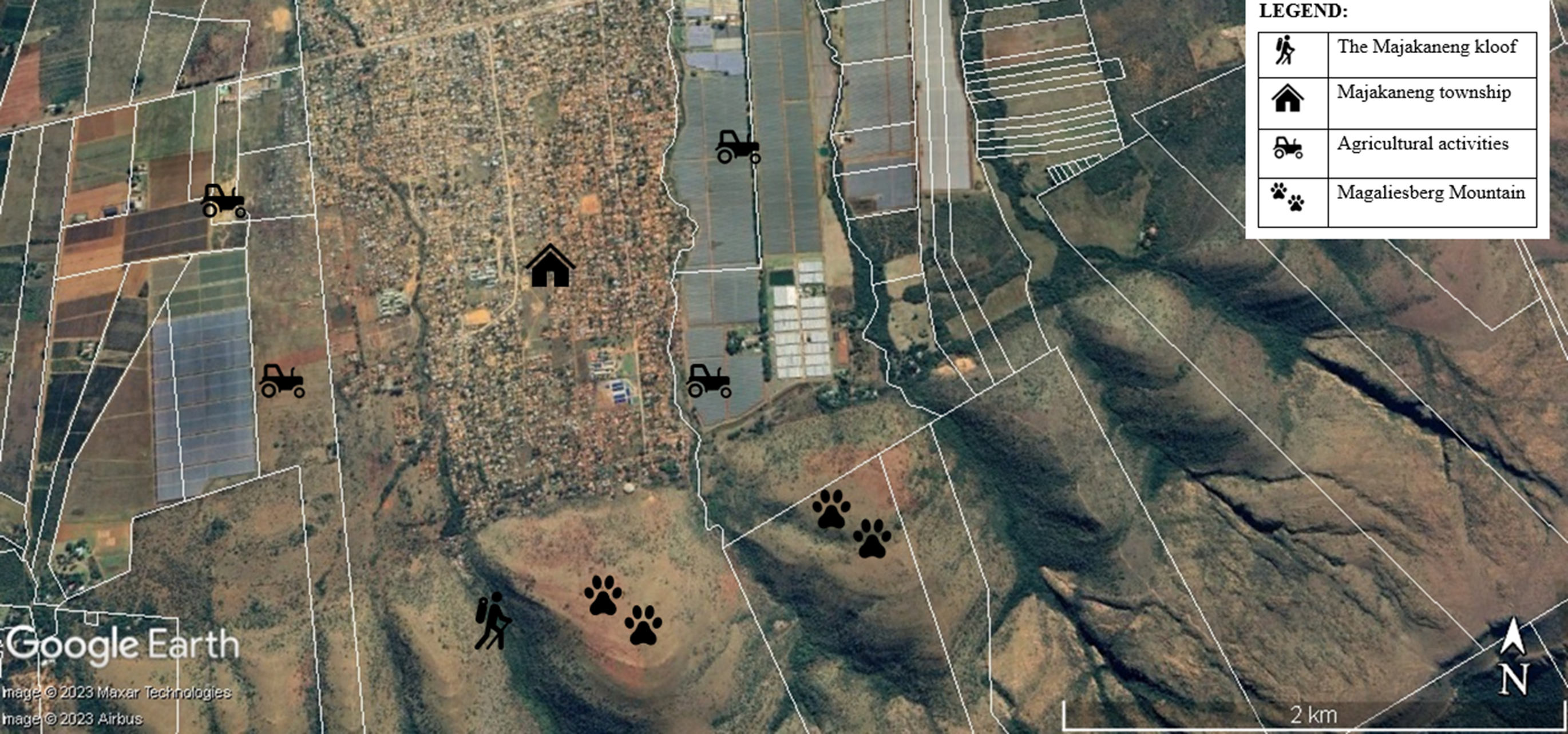 The study area is located within the Bojanala Platinum District Municipality (BPDM) in the North West Province (Image 3). Appropriately, ‘Bojanala’ is the Setswana word for tourism, reflecting the value of the Magaliesberg mountain range a sanctuary for threatened and protected biodiversity (Desmet et al., 2024) which supports several outdoor activities. Other economic activities, primarily in the low-lying areas of the Magaliesberg, include agriculture, horticulture and the mining and processing of minerals such as platinum group metals, chrome and silica. The Majakaneng kloof adjoins the densely populated Majakaneng township flanked by agricultural activities including strawberries grown under shade cloth